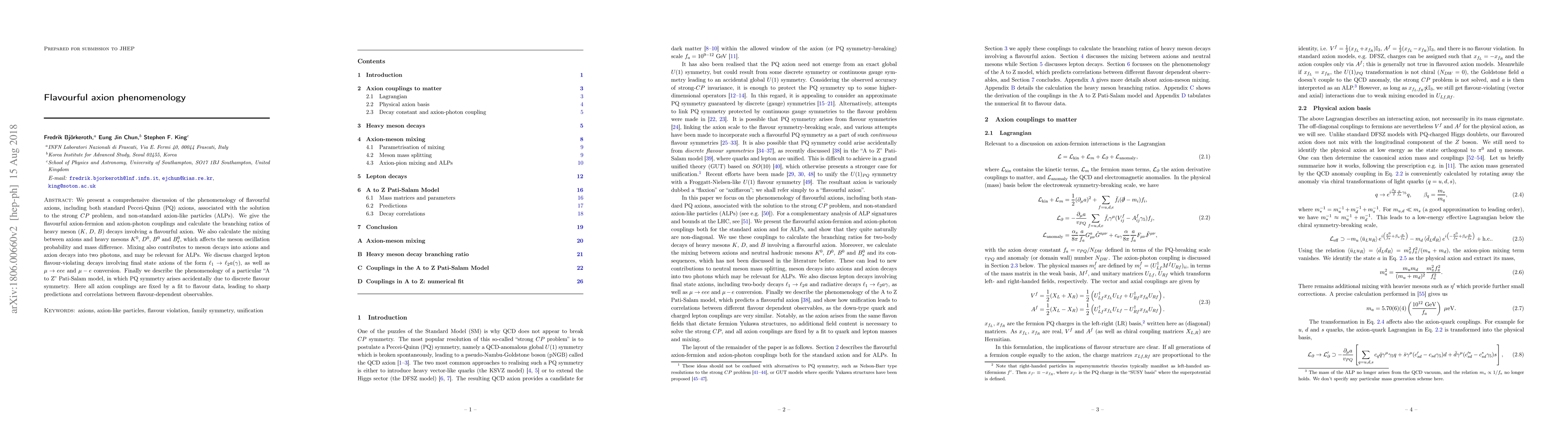 This paper explores the phenomenology of flavourful axions and axion-like particles, detailing their interactions with fermions and photons, and calculating decay branching ratios and mixing effects in heavy mesons. It also discusses implications for charged lepton flavour-violating decays and presents a Pati-Salam model where axion couplings are determined by flavour data, leading to precise predictions.