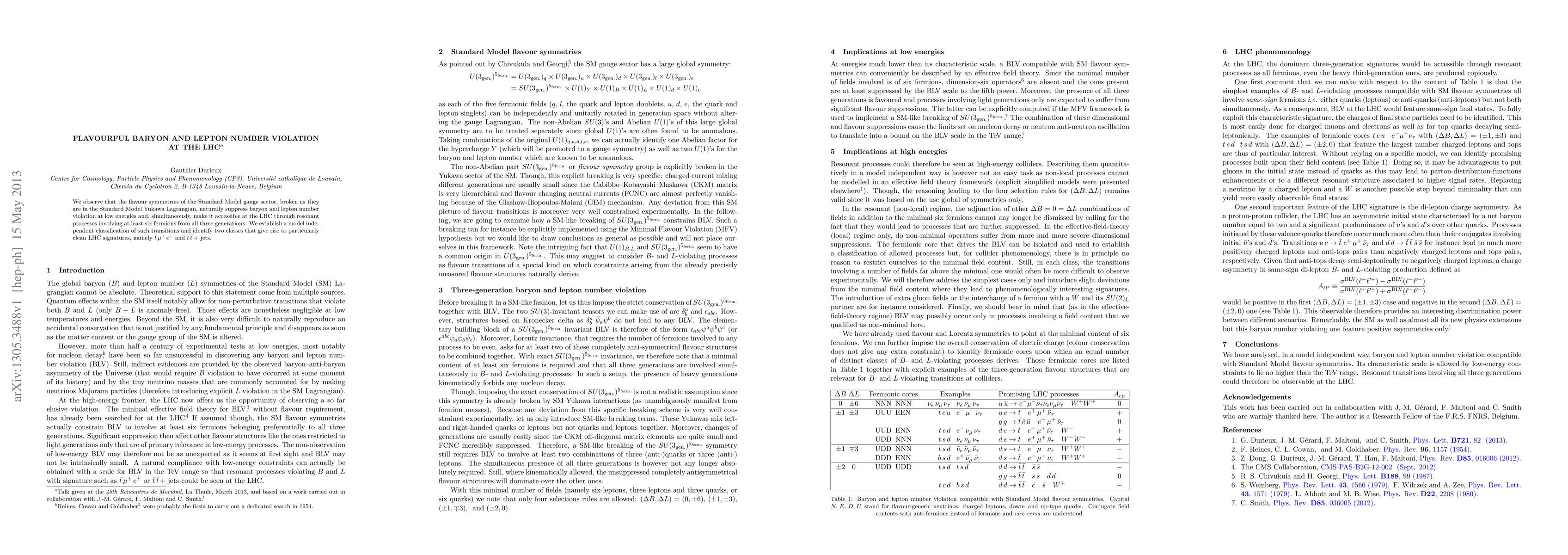 We observe that the flavour symmetries of the Standard Model gauge sector, broken as they are in the Standard Model Yukawa Lagrangian, naturally suppress baryon and lepton number violation at low energies and, simultaneously, make it accessible at the LHC through resonant processes involving at least six fermions from all three generations. We establish a model independent classification of such transitions and identify two classes that give rise to particularly clean LHC signatures, namely $\bar t \mu^+ e^+$ and $\bar t \bar t$ + jets.
