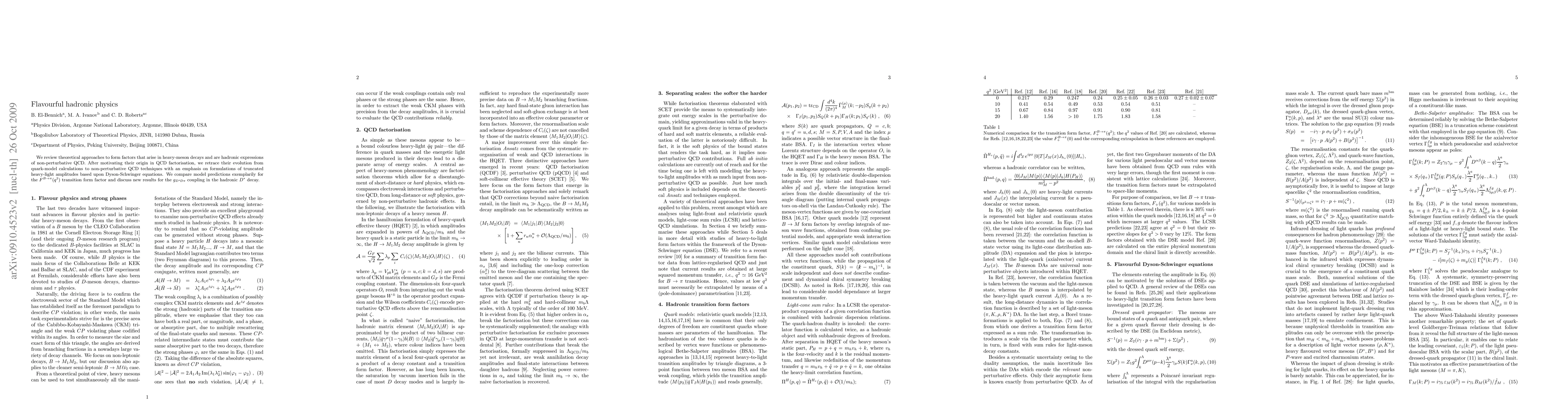 We review theoretical approaches to form factors that arise in heavy-meson decays and are hadronic expressions of non-perturbative QCD. After motivating their origin in QCD factorisation, we retrace their evolution from quark-model calculations to non-perturbative QCD techniques with an emphasis on formulations of truncated heavy-light amplitudes based upon Dyson-Schwinger equations. We compare model predictions exemplarily for the B\to\pi transition form factor and discuss new results for the g_{D*D\pi} coupling in the hadronic D* decay.