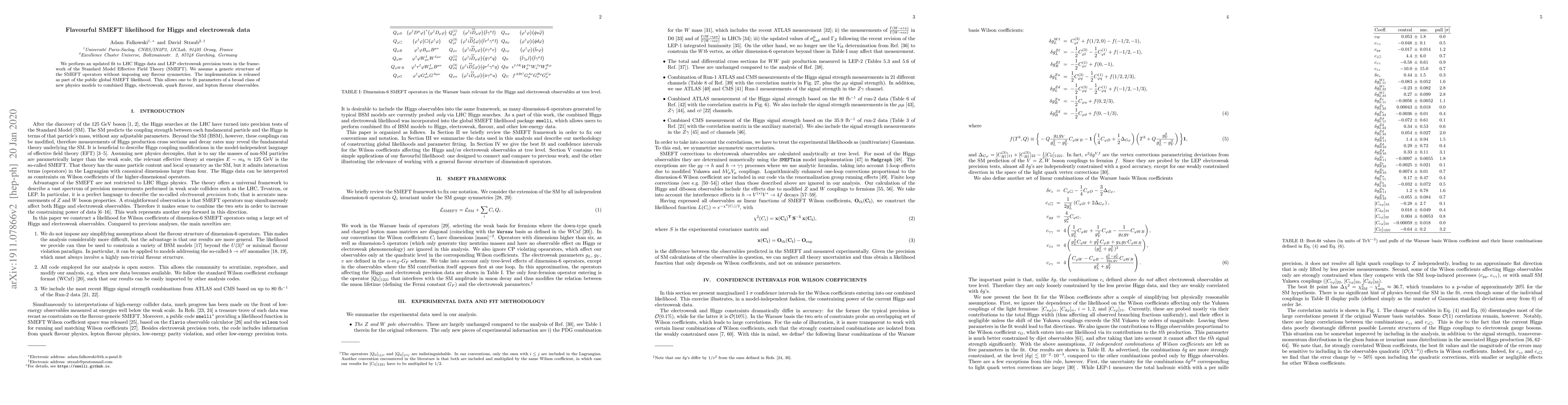 This paper updates the fit of LHC Higgs data and LEP electroweak precision tests within the Standard Model Effective Field Theory (SMEFT) without assuming any flavour symmetries, releasing the implementation as part of a public global SMEFT likelihood for fitting new physics models against various observables.