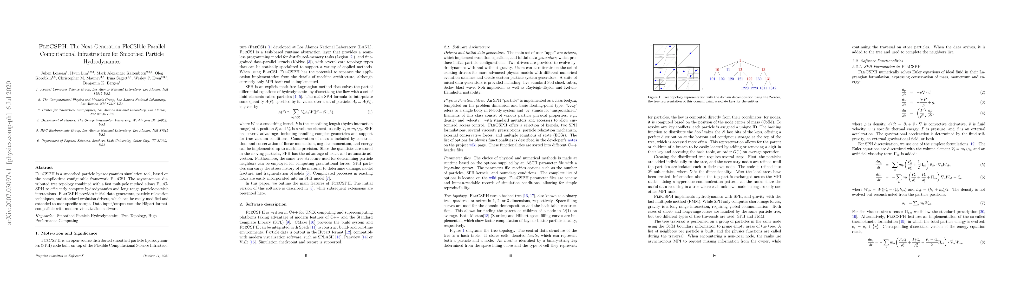 FleCSPH is a next-generation parallel computational framework for smoothed particle hydrodynamics, leveraging the FleCSI framework for efficient distributed computing and long-range interactions. It supports flexible data input/output in H5part format for seamless integration with visualization tools.