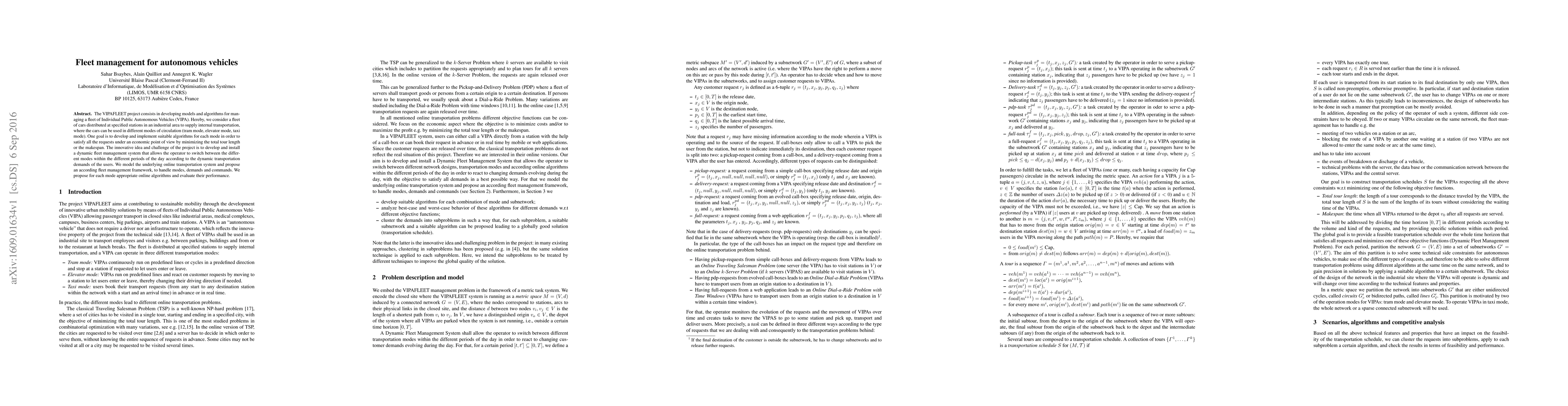 The VIPAFLEET project develops models and algorithms for managing a fleet of autonomous vehicles operating in various modes to meet dynamic transportation demands economically. The study proposes an online fleet management framework and evaluates algorithms for each mode to optimize tour length and makespan.