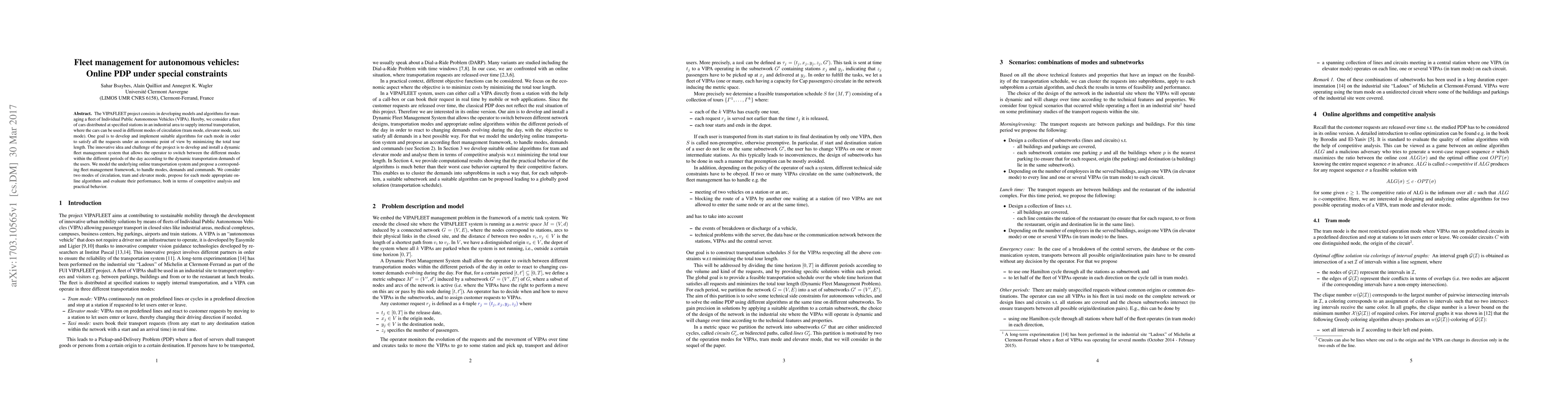 The VIPAFLEET project consists in developing models and algorithms for man- aging a fleet of Individual Public Autonomous Vehicles (VIPA). Hereby, we consider a fleet of cars distributed at specified stations in an industrial area to supply internal transportation, where the cars can be used in different modes of circulation (tram mode, elevator mode, taxi mode). One goal is to develop and implement suitable algorithms for each mode in order to satisfy all the requests under an economic point of view by minimizing the total tour length. The innovative idea and challenge of the project is to develop and install a dynamic fleet management system that allows the operator to switch between the different modes within the different periods of the day according to the dynamic transportation demands of the users. We model the underlying online transportation system and propose a correspond- ing fleet management framework, to handle modes, demands and commands. We consider two modes of circulation, tram and elevator mode, propose for each mode appropriate on- line algorithms and evaluate their performance, both in terms of competitive analysis and practical behavior.