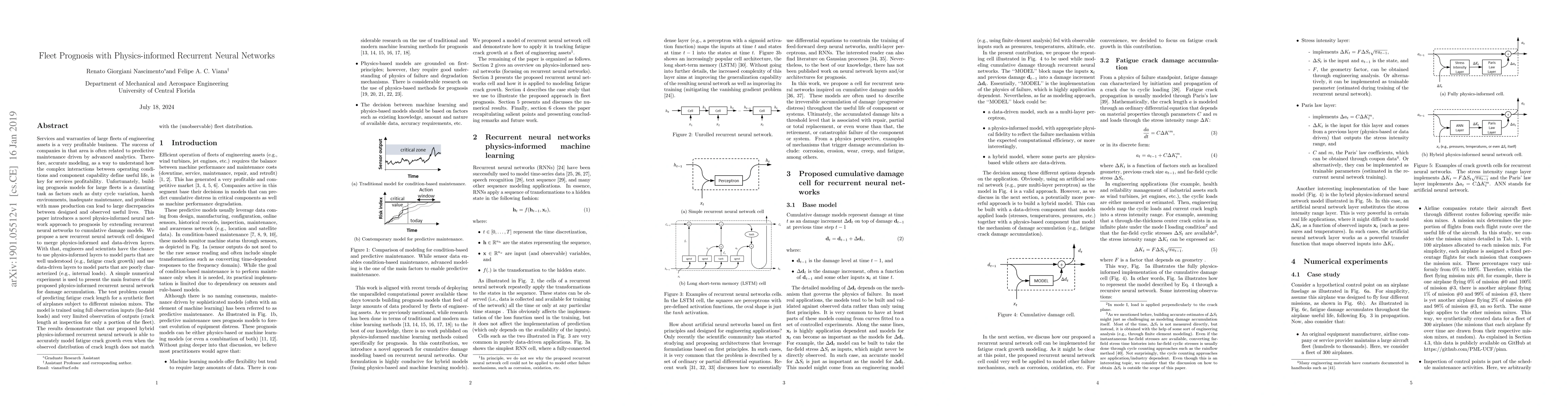 Services and warranties of large fleets of engineering assets is a very profitable business. The success of companies in that area is often related to predictive maintenance driven by advanced analytics. Therefore, accurate modeling, as a way to understand how the complex interactions between operating conditions and component capability define useful life, is key for services profitability. Unfortunately, building prognosis models for large fleets is a daunting task as factors such as duty cycle variation, harsh environments, inadequate maintenance, and problems with mass production can lead to large discrepancies between designed and observed useful lives. This paper introduces a novel physics-informed neural network approach to prognosis by extending recurrent neural networks to cumulative damage models. We propose a new recurrent neural network cell designed to merge physics-informed and data-driven layers. With that, engineers and scientists have the chance to use physics-informed layers to model parts that are well understood (e.g., fatigue crack growth) and use data-driven layers to model parts that are poorly characterized (e.g., internal loads). A simple numerical experiment is used to present the main features of the proposed physics-informed recurrent neural network for damage accumulation. The test problem consist of predicting fatigue crack length for a synthetic fleet of airplanes subject to different mission mixes. The model is trained using full observation inputs (far-field loads) and very limited observation of outputs (crack length at inspection for only a portion of the fleet). The results demonstrate that our proposed hybrid physics-informed recurrent neural network is able to accurately model fatigue crack growth even when the observed distribution of crack length does not match with the (unobservable) fleet distribution.
