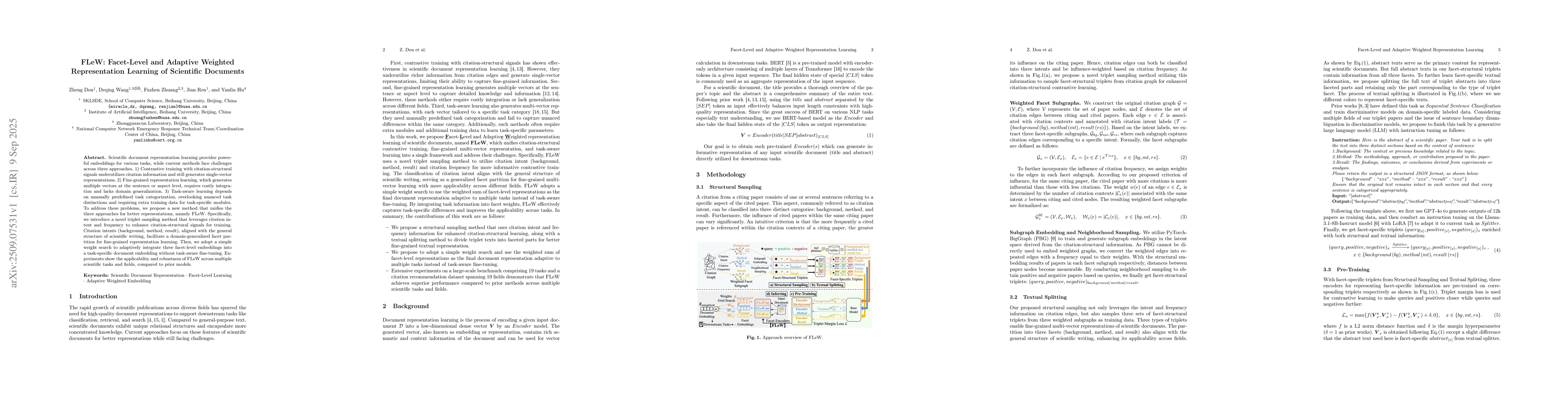 Scientific document representation learning provides powerful embeddings for various tasks, while current methods face challenges across three approaches. 1) Contrastive training with citation-structural signals underutilizes citation information and still generates single-vector representations. 2) Fine-grained representation learning, which generates multiple vectors at the sentence or aspect level, requires costly integration and lacks domain generalization. 3) Task-aware learning depends on manually predefined task categorization, overlooking nuanced task distinctions and requiring extra training data for task-specific modules. To address these problems, we propose a new method that unifies the three approaches for better representations, namely FLeW. Specifically, we introduce a novel triplet sampling method that leverages citation intent and frequency to enhance citation-structural signals for training. Citation intents (background, method, result), aligned with the general structure of scientific writing, facilitate a domain-generalized facet partition for fine-grained representation learning. Then, we adopt a simple weight search to adaptively integrate three facet-level embeddings into a task-specific document embedding without task-aware fine-tuning. Experiments show the applicability and robustness of FLeW across multiple scientific tasks and fields, compared to prior models.