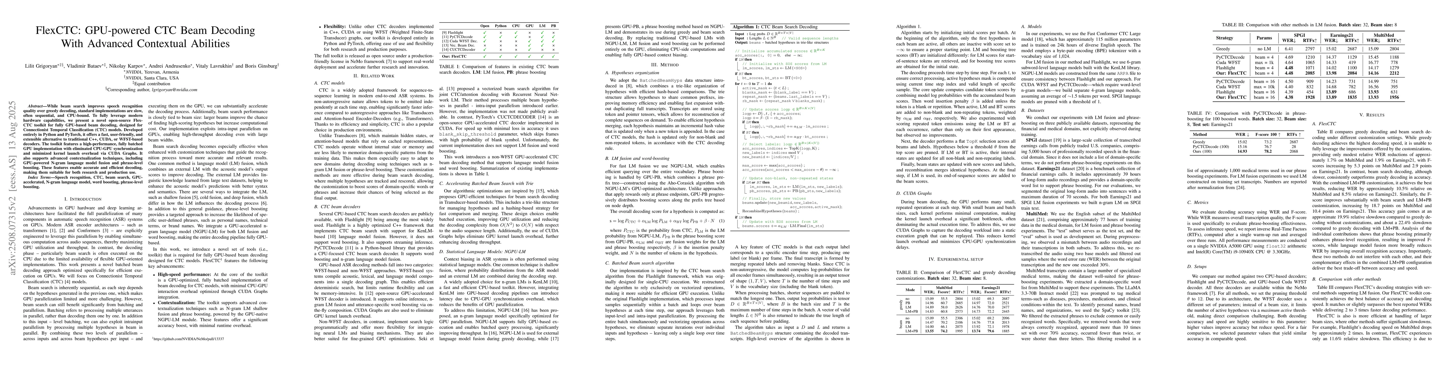 The paper presents FlexCTC, a GPU-powered CTC beam decoding toolkit developed in Python and PyTorch, designed for Connectionist Temporal Classification (CTC) models. It offers a fast, user-friendly, and extensible alternative to traditional C++, CUDA, or WFST-based decoders with a high-performance, fully batched GPU implementation and advanced contextualization techniques.
