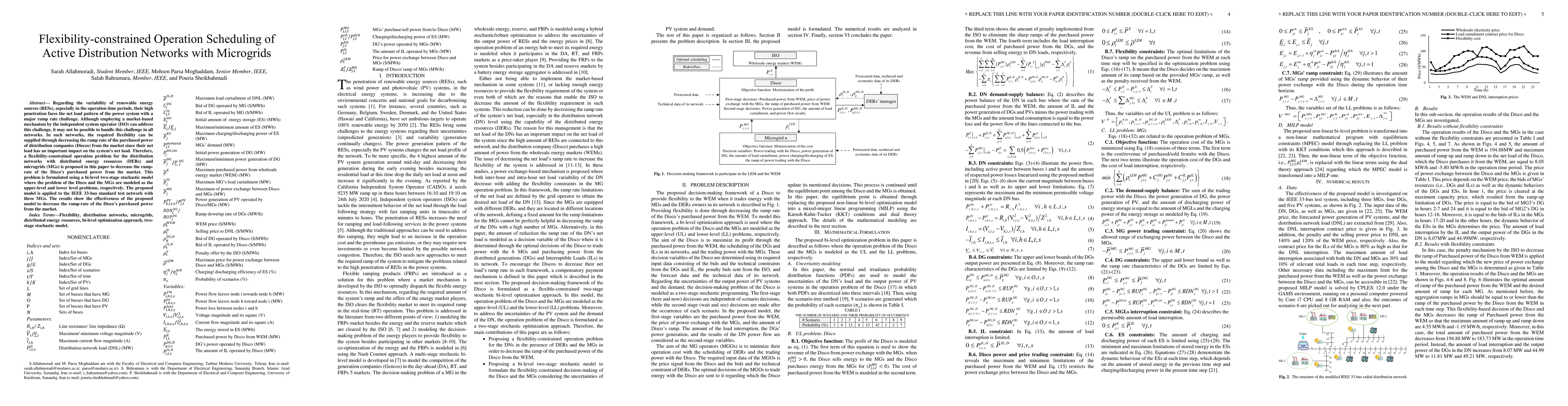 This paper proposes a flexibility-constrained operation scheduling model for active distribution networks incorporating microgrids to mitigate the ramp rate challenge posed by high renewable energy penetration. The model, formulated as a bi-level two-stage stochastic problem, effectively reduces the ramp rate of distribution companies' market-purchased power through optimized scheduling of distributed energy resources.