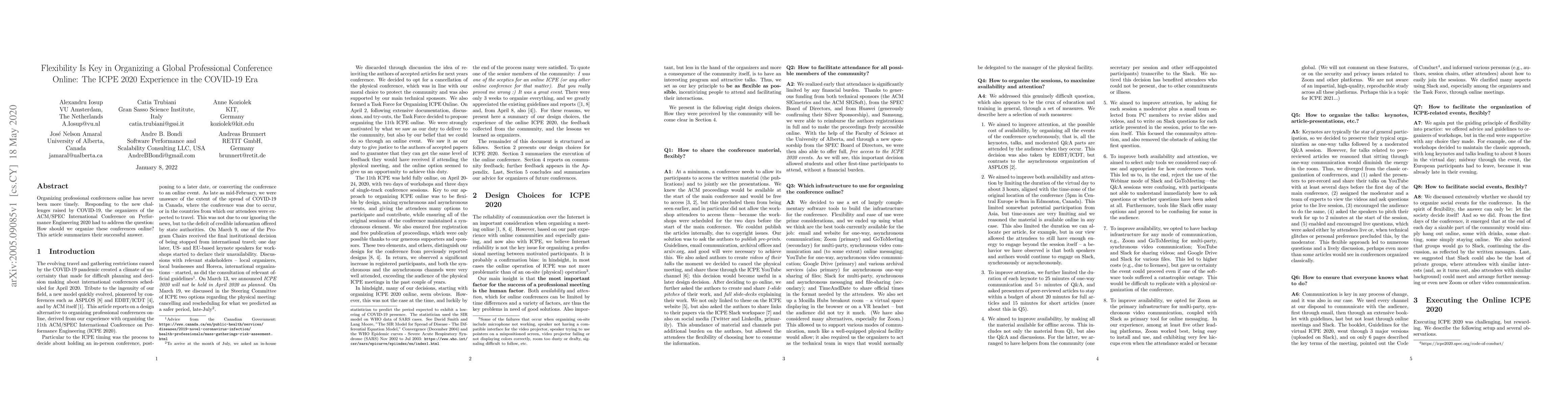 The paper discusses the successful organization of the ICPE 2020 conference online amidst the COVID-19 pandemic, emphasizing the importance of flexibility in adapting to new challenges. The experience provides valuable insights into effectively hosting global professional conferences virtually.