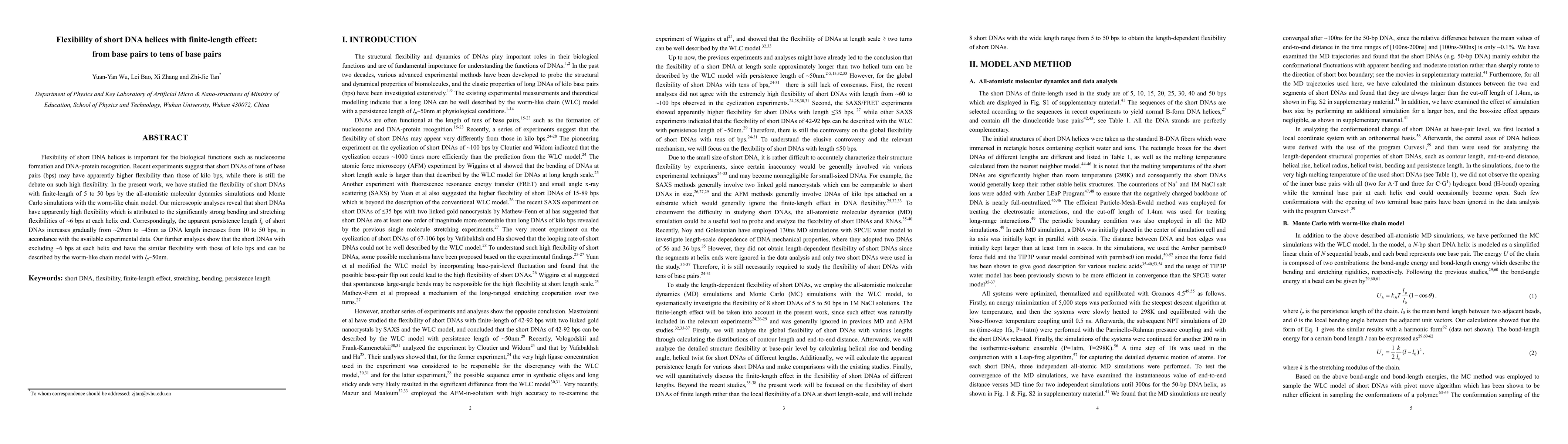 Flexibility of short DNA helices is important for the biological functions such as nucleosome formation and DNA-protein recognition. Recent experiments suggest that short DNAs of tens of base pairs (bps) may have apparently higher flexibility than those of kilo bps, while there is still the debate on such high flexibility. In the present work, we have studied the flexibility of short DNAs with finite-length of 5 to 50 bps by the all-atomistic molecular dynamics simulations and Monte Carlo simulations with the worm-like chain model. Our microscopic analyses reveal that short DNAs have apparently high flexibility which is attributed to the significantly strong bending and stretching flexibilities of ~6 bps at each helix end. Correspondingly, the apparent persistence length lp of short DNAs increases gradually from ~29nm to ~45nm as DNA length increases from 10 to 50 bps, in accordance with the available experimental data. Our further analyses show that the short DNAs with excluding ~6 bps at each helix end have the similar flexibility with those of kilo bps and can be described by the worm-like chain model with lp~50nm.