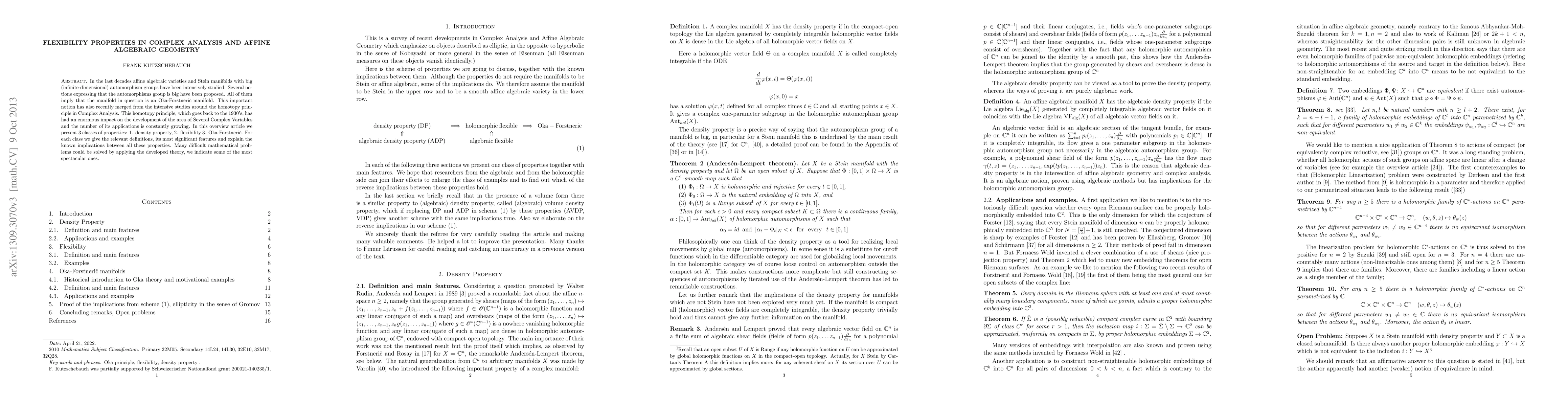 This paper reviews three key classes of properties in Complex Analysis and Affine Algebraic Geometry: density, flexibility, and Oka-Forstneri\v{c}. It explains definitions, significant features, and implications between these properties, highlighting their importance in solving complex mathematical problems.