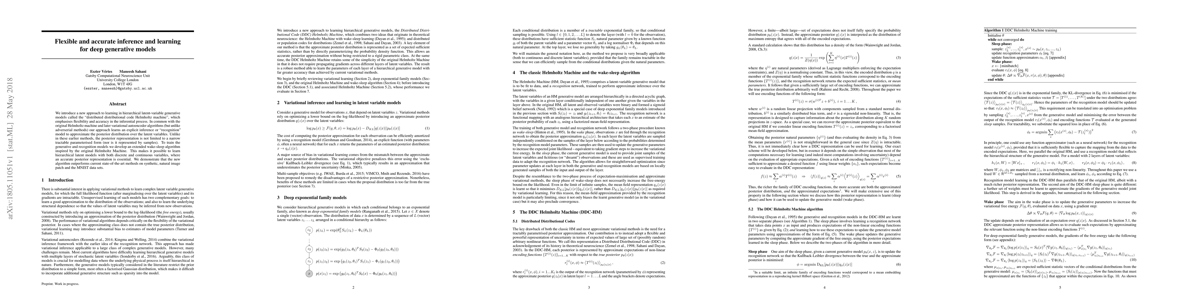 We introduce a new approach to learning in hierarchical latent-variable generative models called the "distributed distributional code Helmholtz machine", which emphasises flexibility and accuracy in the inferential process. In common with the original Helmholtz machine and later variational autoencoder algorithms (but unlike adverserial methods) our approach learns an explicit inference or "recognition" model to approximate the posterior distribution over the latent variables. Unlike in these earlier methods, the posterior representation is not limited to a narrow tractable parameterised form (nor is it represented by samples). To train the generative and recognition models we develop an extended wake-sleep algorithm inspired by the original Helmholtz Machine. This makes it possible to learn hierarchical latent models with both discrete and continuous variables, where an accurate posterior representation is essential. We demonstrate that the new algorithm outperforms current state-of-the-art methods on synthetic, natural image patch and the MNIST data sets.