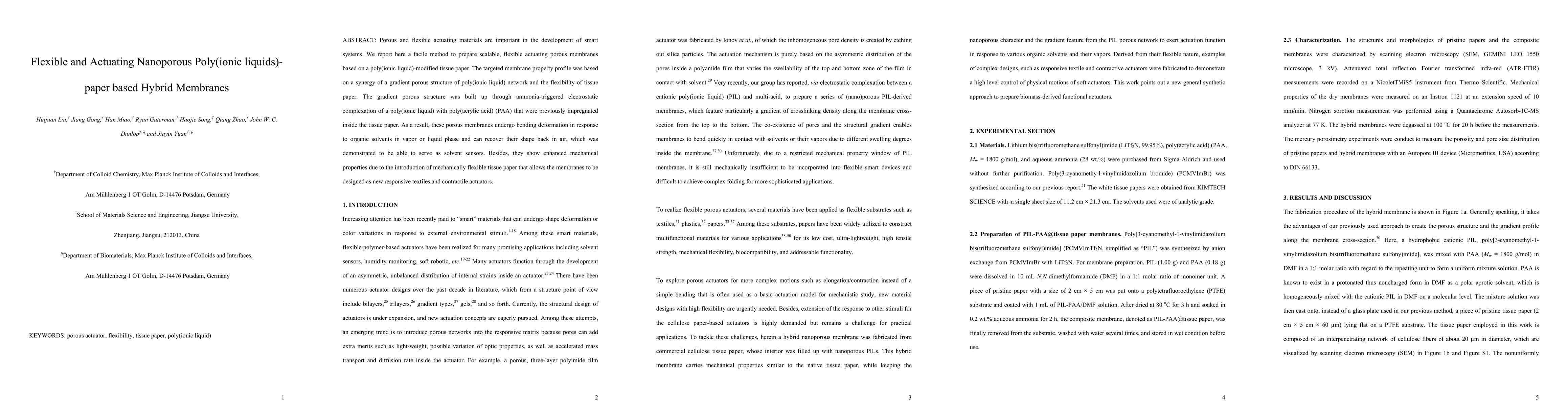 This paper presents a scalable method for creating flexible, actuating porous membranes based on poly(ionic liquid)-modified tissue paper, combining a gradient porous structure with the flexibility of tissue paper. These membranes can bend in response to organic solvents and recover their shape, making them suitable for use as solvent sensors and responsive textiles.