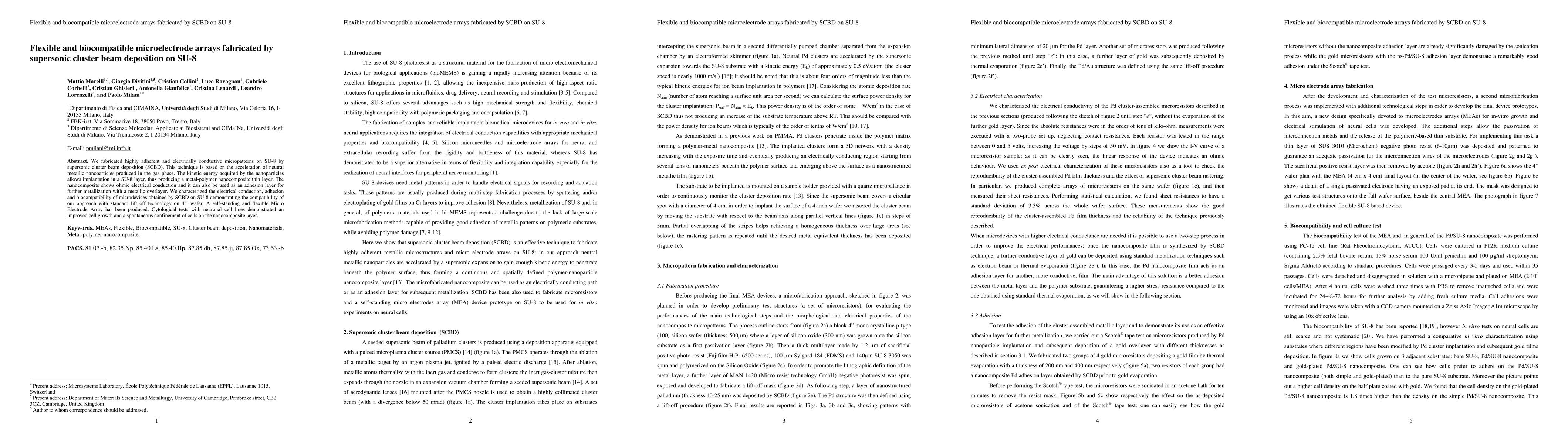 We fabricated highly adherent and electrically conductive micropatterns on SU-8 by supersonic cluster beam deposition (SCBD). This technique is based on the acceleration of neutral metallic nanoparticles produced in the gas phase. The kinetic energy acquired by the nanoparticles allows implantation in a SU-8 layer, thus producing a metal-polymer nanocomposite thin layer. The nanocomposite shows ohmic electrical conduction and it can also be used as an adhesion layer for further metallization with a metallic overlayer. We characterized the electrical conduction, adhesion and biocompatibility of microdevices obtained by SCBD on SU-8 demonstrating the compatibility of our approach with standard lift off technology on 4" wafer. A self-standing and flexible Micro Electrode Array has been produced. Cytological tests with neuronal cell lines demonstrated an improved cell growth and a spontaneous confinement of cells on the nanocomposite layer.