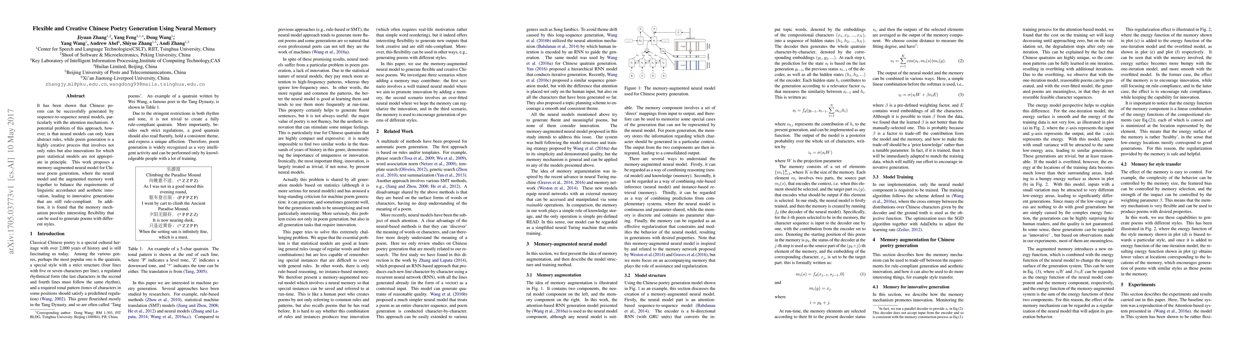 It has been shown that Chinese poems can be successfully generated by sequence-to-sequence neural models, particularly with the attention mechanism. A potential problem of this approach, however, is that neural models can only learn abstract rules, while poem generation is a highly creative process that involves not only rules but also innovations for which pure statistical models are not appropriate in principle. This work proposes a memory-augmented neural model for Chinese poem generation, where the neural model and the augmented memory work together to balance the requirements of linguistic accordance and aesthetic innovation, leading to innovative generations that are still rule-compliant. In addition, it is found that the memory mechanism provides interesting flexibility that can be used to generate poems with different styles.