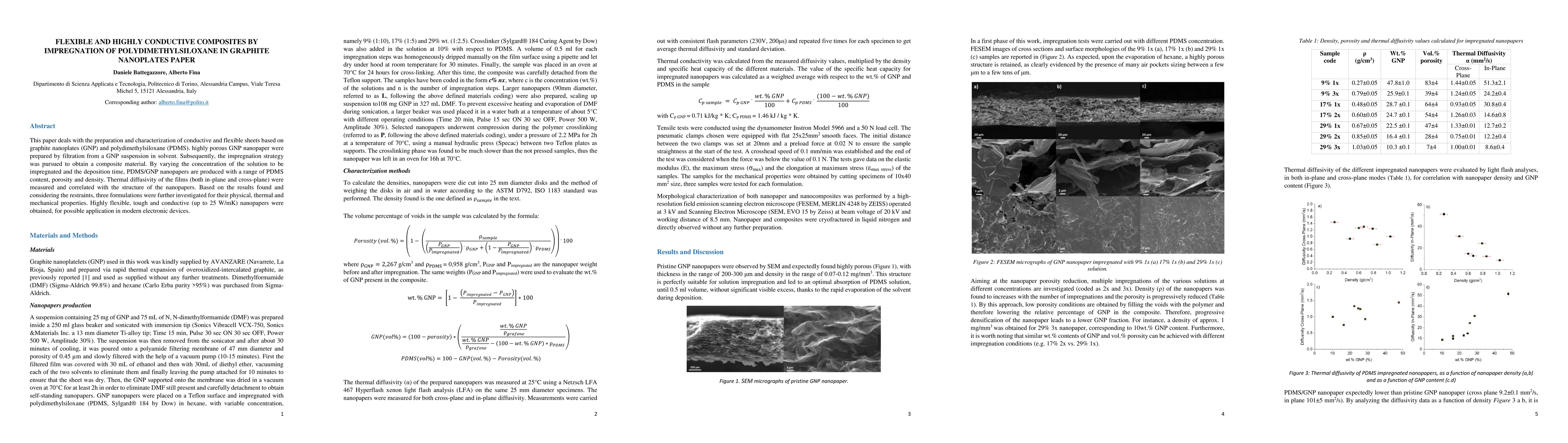 This research presents a method to create flexible, conductive sheets using graphite nanoplates and polydimethylsiloxane. By adjusting solution concentration and deposition time, various PDMS/GNP nanopapers with tailored properties were produced, exhibiting high flexibility, toughness, and conductivity (up to 25 W/mK), suitable for use in advanced electronics.
