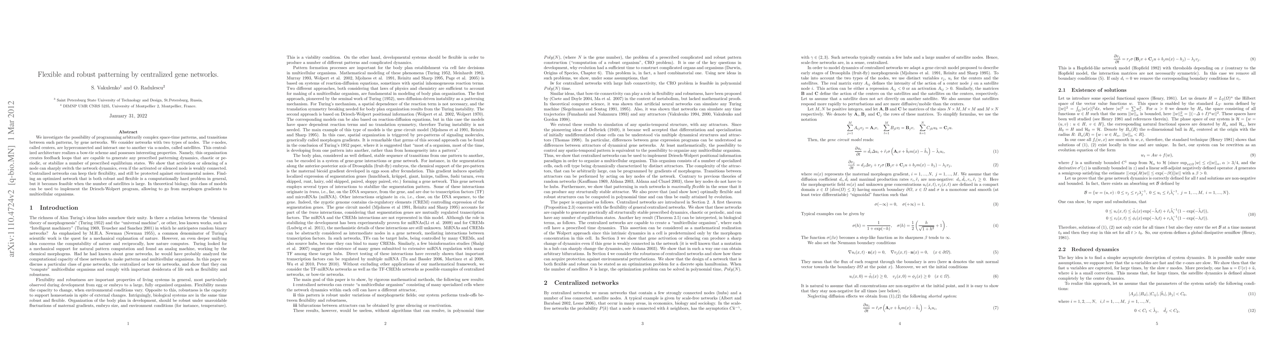 We consider networks with two types of nodes. The v-nodes, called centers, are hyperconnected and interact one to another via many u-nodes, called satellites. This centralized architecture, widespread in gene networks, realize a bow-tie scheme and possesses interesting properties. Namely, this organization creates feedback loops that are capable to generate any prescribed patterning dynamics, chaotic or periodic, and create a number of equilibrium states. We show that activation or silencing of a node can sharply switch the network attractor, even if the activated or silenced node is weakly connected. We distinguish between two dynamically different situations, "power of center" (PC) when satellite response is fast and "satellite power" (SP) when center response is fast. Using a simple network example we show that a centralized network is more robust with respect to time dependent perturbations, in the PC relative to the SP case. In theoretical molecular biology, this class of models can be used to reveal a non-trivial relation between the architecture of protein-DNA and protein-protein interaction networks and controllability of space-time dynamics of cellular processes.