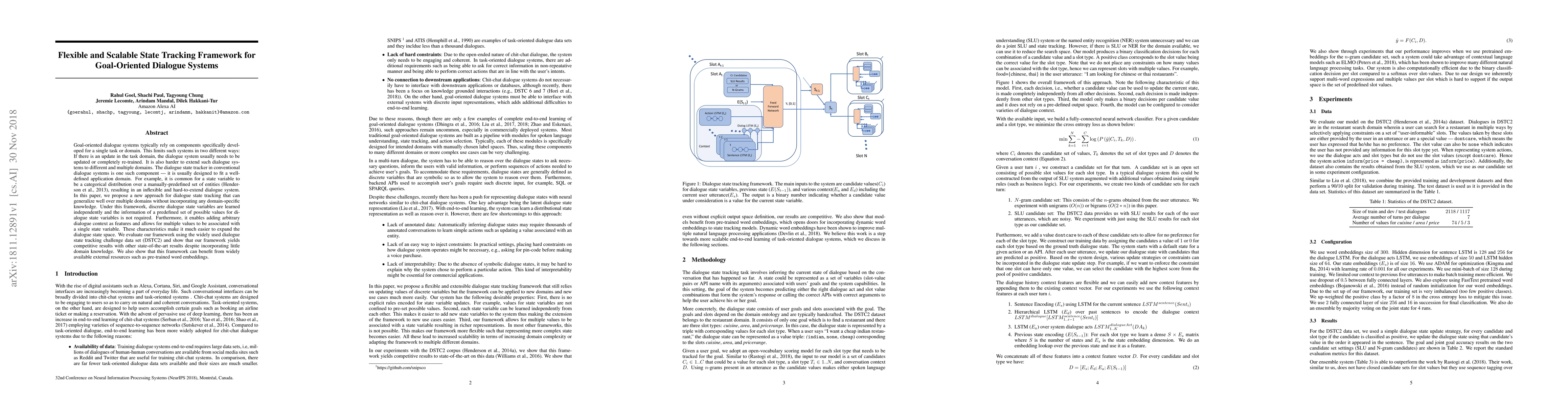This paper proposes a flexible and scalable state tracking framework for goal-oriented dialogue systems that generalizes across multiple domains without requiring domain-specific knowledge. It enables independent learning of discrete state variables and supports the addition of arbitrary dialogue context features, making the system easier to expand.