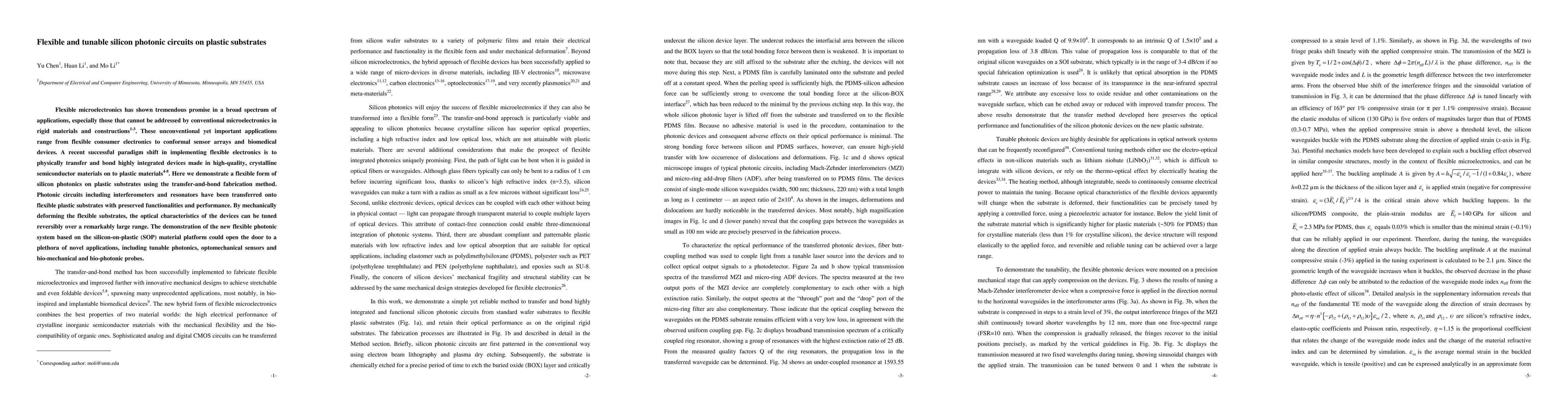 This paper demonstrates flexible silicon photonic circuits on plastic substrates using transfer-and-bond fabrication, preserving functionality and performance. The optical characteristics of the circuits can be reversibly tuned by mechanically deforming the substrate, opening possibilities for novel applications in tunable photonics and bio-photonic probes.