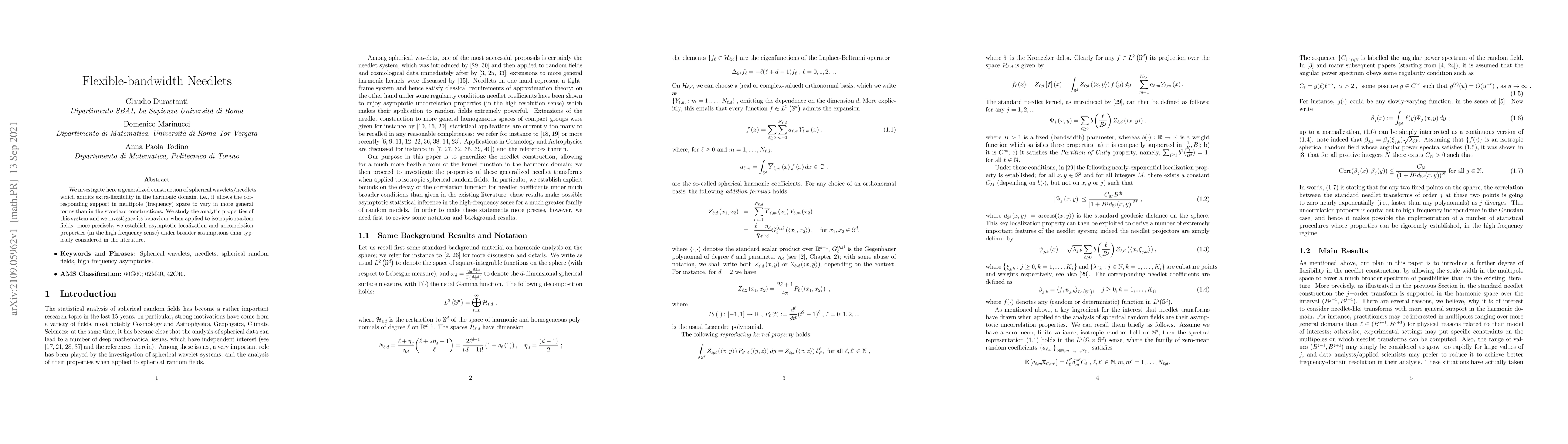 We investigate here a generalized construction of spherical wavelets/needlets which admits extra-flexibility in the harmonic domain, i.e., it allows the corresponding support in multipole (frequency) space to vary in more general forms than in the standard constructions. We study the analytic properties of this system and we investigate its behaviour when applied to isotropic random fields: more precisely, we establish asymptotic localization and uncorrelation properties (in the high-frequency sense) under broader assumptions than typically considered in the literature.
