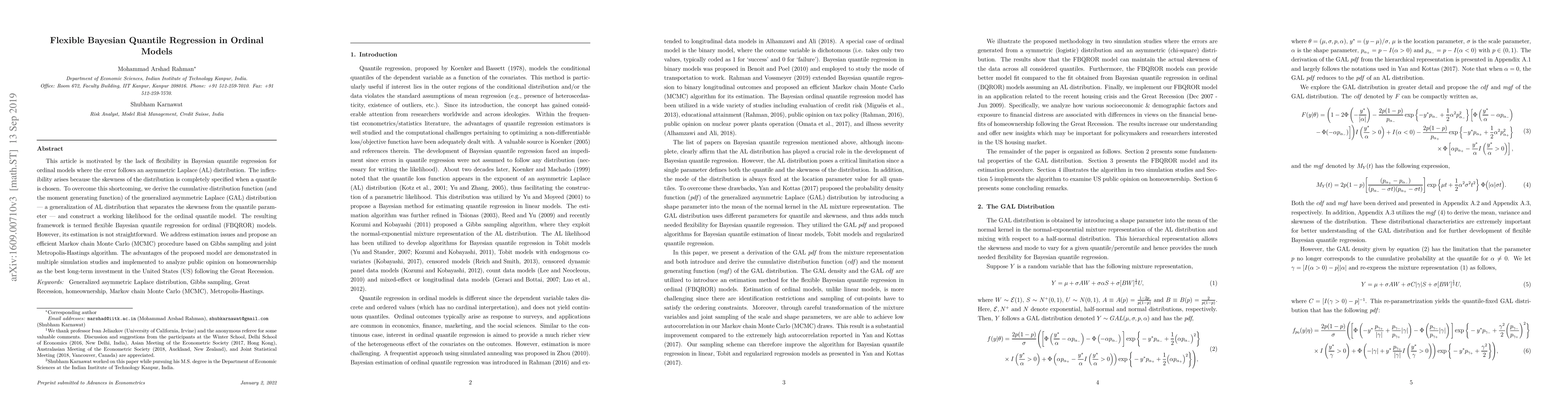 This paper proposes a flexible Bayesian quantile regression method for ordinal models (FBQROR) using a generalized asymmetric Laplace (GAL) distribution, allowing specific quantiles to be fixed while permitting mode, skewness, and tails to vary. The method is demonstrated through simulations and applied to analyze public opinion on homeownership investment in the U.S.