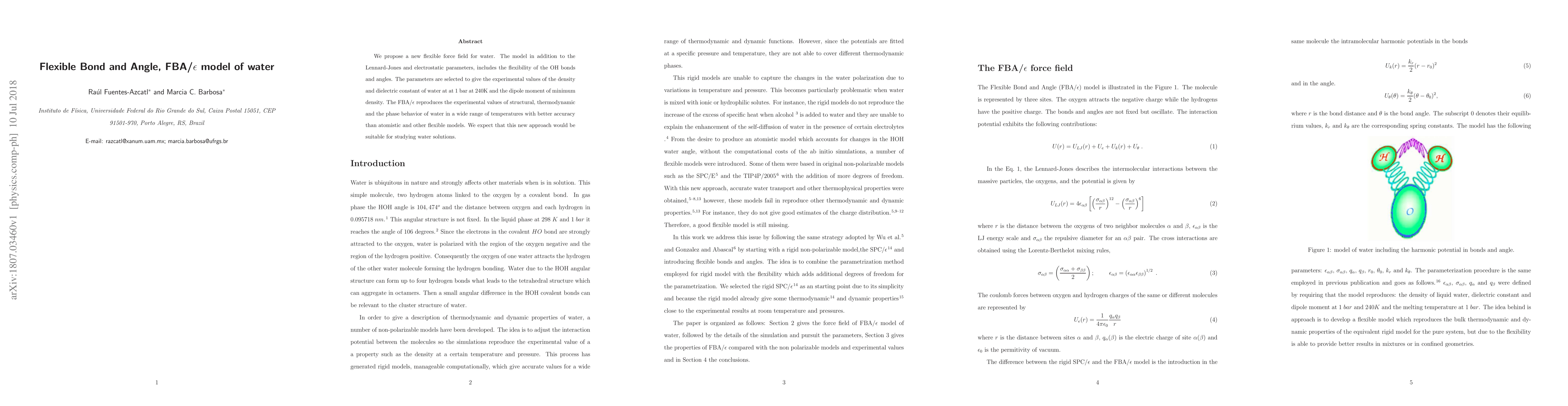 We propose a new flexible force field for water. The model in addition to the Lennard-Jones and electrostatic parameters, includes the flexibility of the OH bonds and angles. The parameters are selected to give the experimental values of the density and dielectric constant of water at at 1 bar at 240K and the dipole moment of minimum density. The FBA/epsilon reproduces the experimental values of structural, thermodynamic and the phase behavior of water in a wide range of temperatures with better accuracy than atomistic and other flexible models. We expect that this new approach would be suitable for studying water solutions.