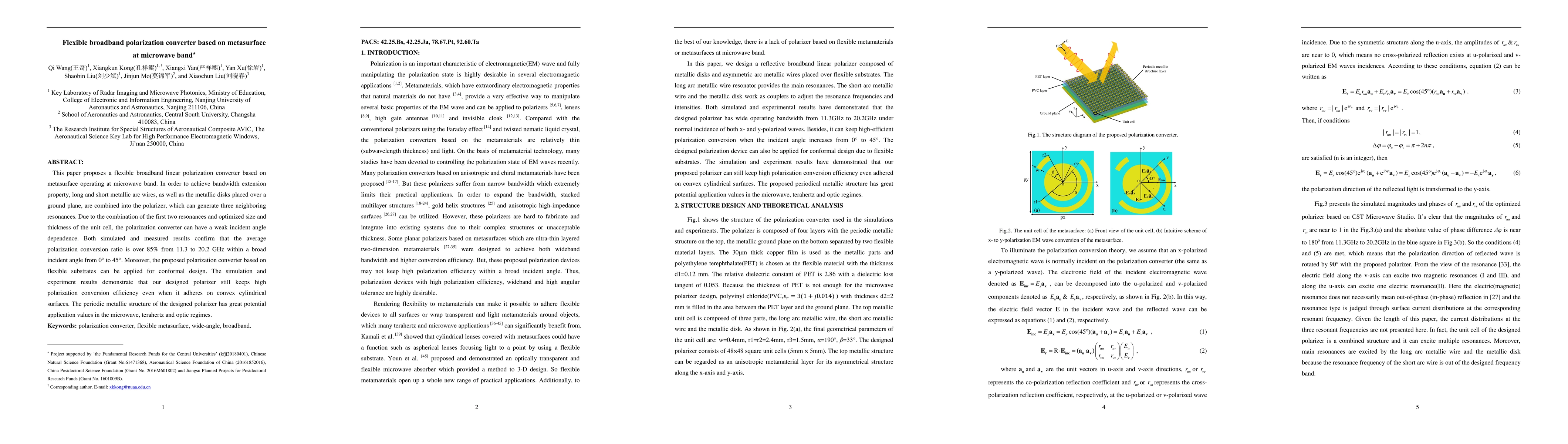 This paper presents a flexible broadband polarization converter based on a metasurface operating in the microwave band, utilizing long and short metallic arc wires and disks to achieve three resonances, resulting in high polarization conversion efficiency over 85% from 11.3 to 20.2 GHz and angle-invariance. The design's flexibility enables conformal applications on curved surfaces.