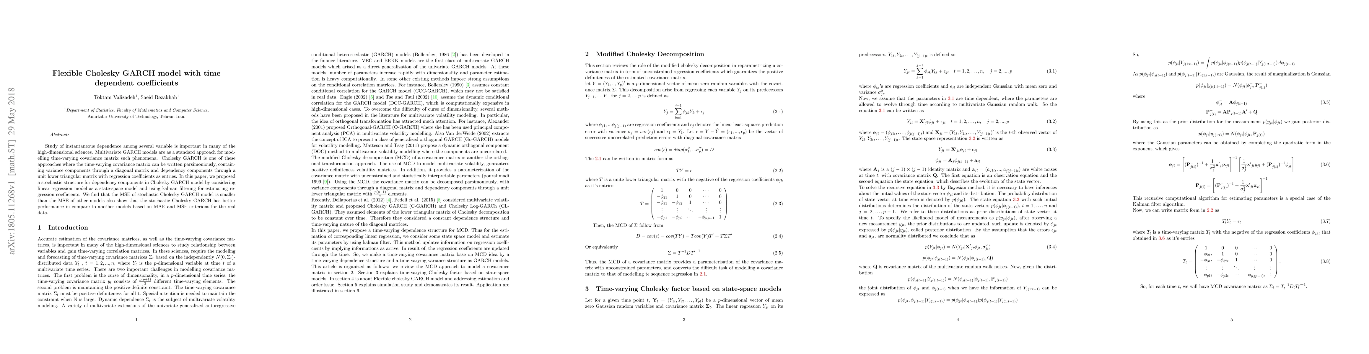 Study of instantaneous dependence among several variable is important in many of the high-dimensional sciences. Multivariate GARCH models are as a standard approach for modelling time-varying covariance matrix such phenomena. Cholesky GARCH is one of these approaches where the time-varying covariance matrix can be written parsimoniously, containing variance components through a diagonal matrix and dependency components through a unit lower triangular matrix with regression coefficients as entries. In this paper, we proposed a stochastic structure for dependency components in Cholesky GARCH model by considering linear regression model as a state-space model and using kalman filtering for estimating regression coefficients. We find that the MSE of stochastic Cholesky GARCH model is smaller than the MSE of other models also show that the stochastic Cholesky GARCH has better performance in compare to another models based on MAE and MSE criterions for the real data.