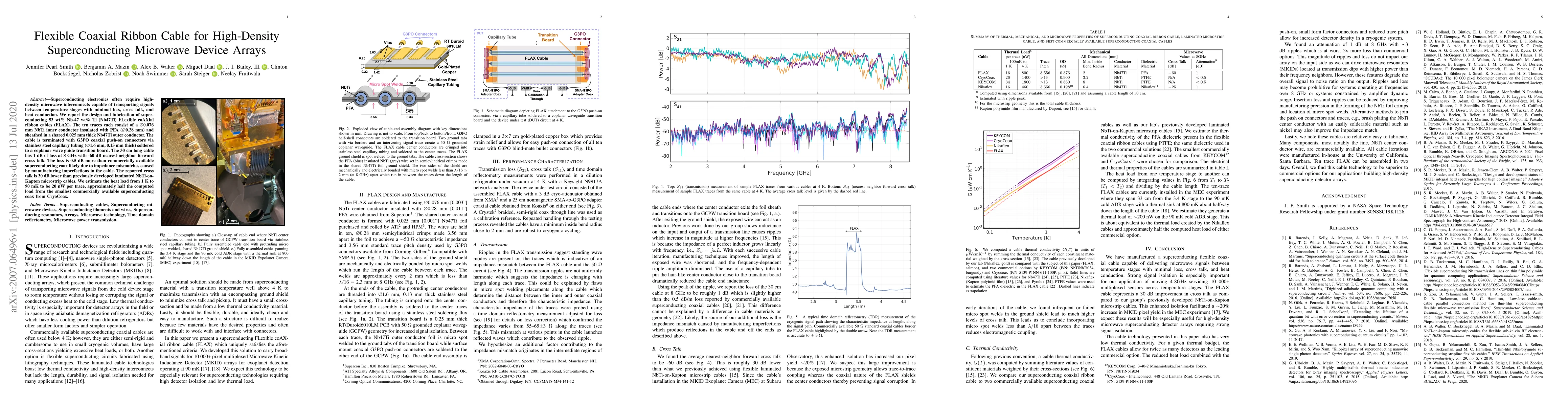 This paper details the design and fabrication of a high-density superconducting coaxial ribbon cable (FLAX) using Nb47Ti, achieving minimal loss and cross talk for microwave signal transport. The cable exhibits 1 dB loss at 8 GHz and significantly lower heat conduction compared to commercial alternatives.