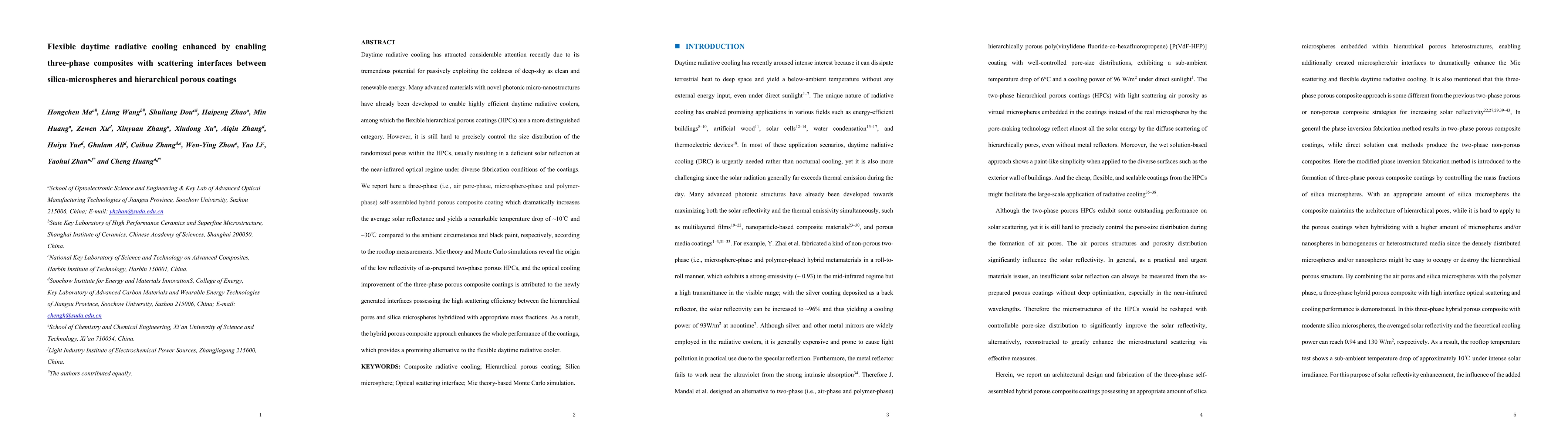 This paper presents a three-phase composite coating with silica microspheres and hierarchical porous coatings that significantly enhances daytime radiative cooling. The new interfaces between the components improve scattering efficiency and solar reflectance, leading to a notable temperature drop of ~10 degC compared to ambient conditions.