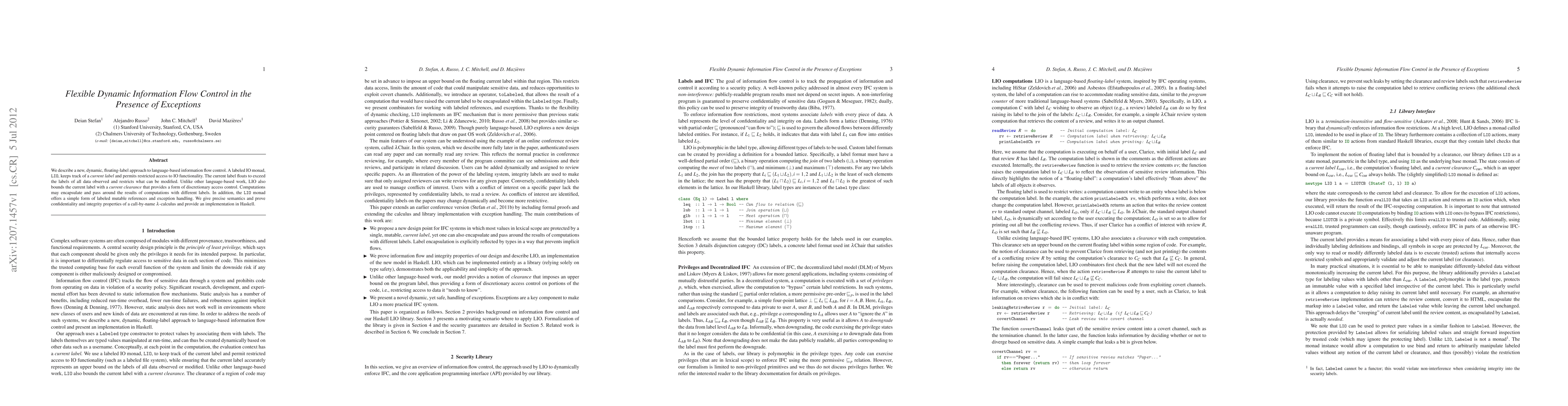 This paper introduces a dynamic, floating-label approach for language-based information flow control using a labeled IO monad, LIO, which manages labels and clearances to restrict access and modify data. It also provides a mechanism for handling exceptions and encapsulates computations with different labels.