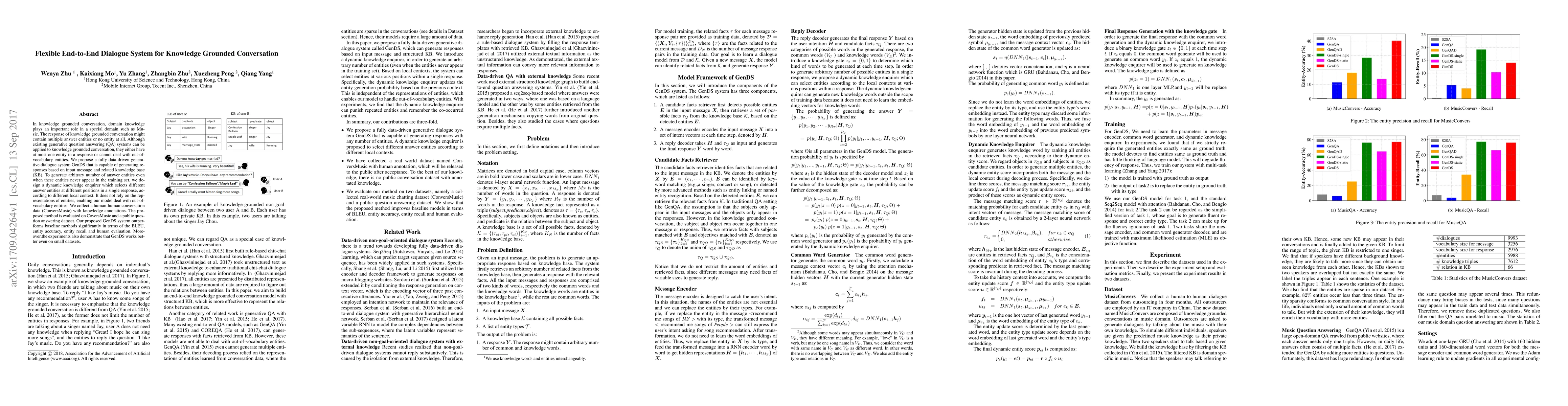 The paper proposes GenDS, a data-driven generative dialogue system for knowledge grounded conversation, capable of generating multiple answer entities and handling out-of-vocabulary entities. GenDS outperforms baselines in metrics like BLEU, entity accuracy, and recall, and works well even on small datasets.