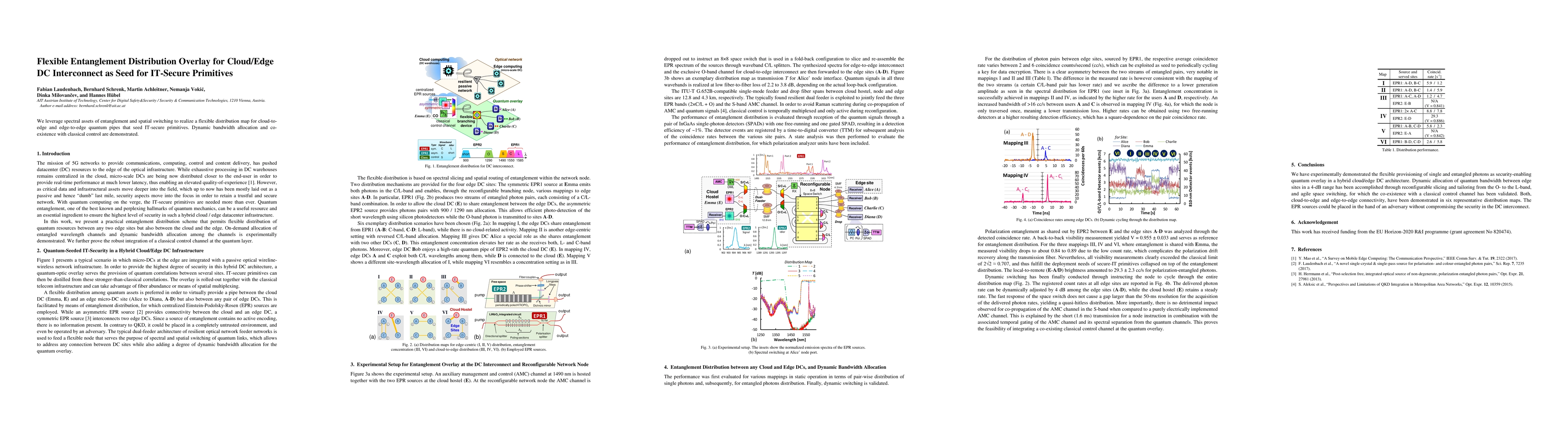This paper proposes a flexible entanglement distribution overlay for cloud/edge data center interconnects, utilizing quantum entanglement and spatial switching to create secure IT primitives. The system demonstrates dynamic bandwidth allocation and compatibility with classical control.