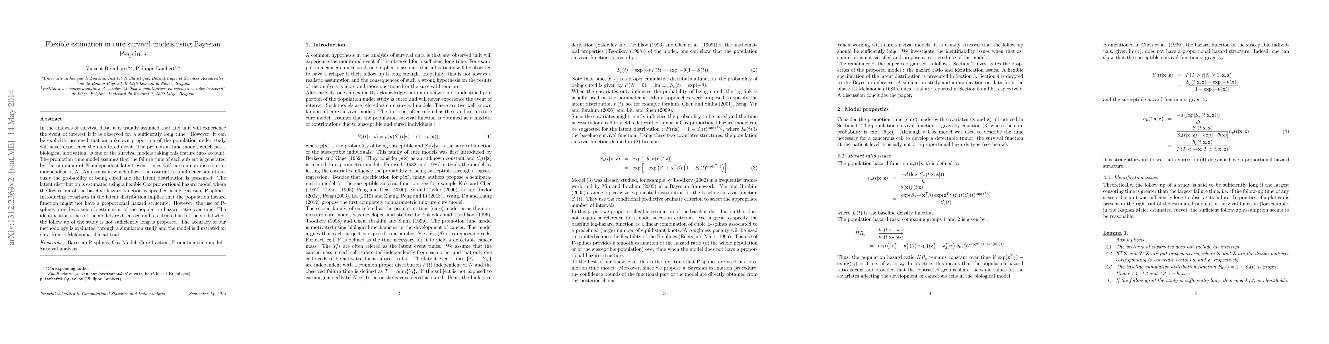 This paper proposes an extension of the promotion time model to incorporate covariates that affect both the probability of being cured and the latent distribution of event times. The authors use Bayesian P-splines for flexible estimation of the baseline hazard function, allowing for smooth hazard ratio changes over time. The model is evaluated through simulations and applied to melanoma clinical trial data.