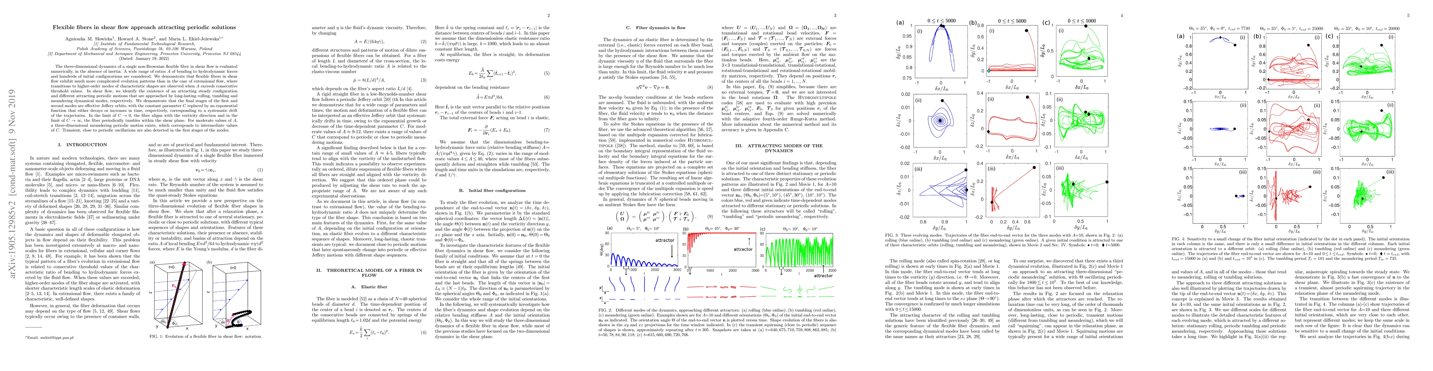 Flexible fibers in shear flow exhibit complex evolution patterns, including attracting periodic motions like rolling, tumbling, and meandering modes, which can align with the vorticity direction or periodically tumble.