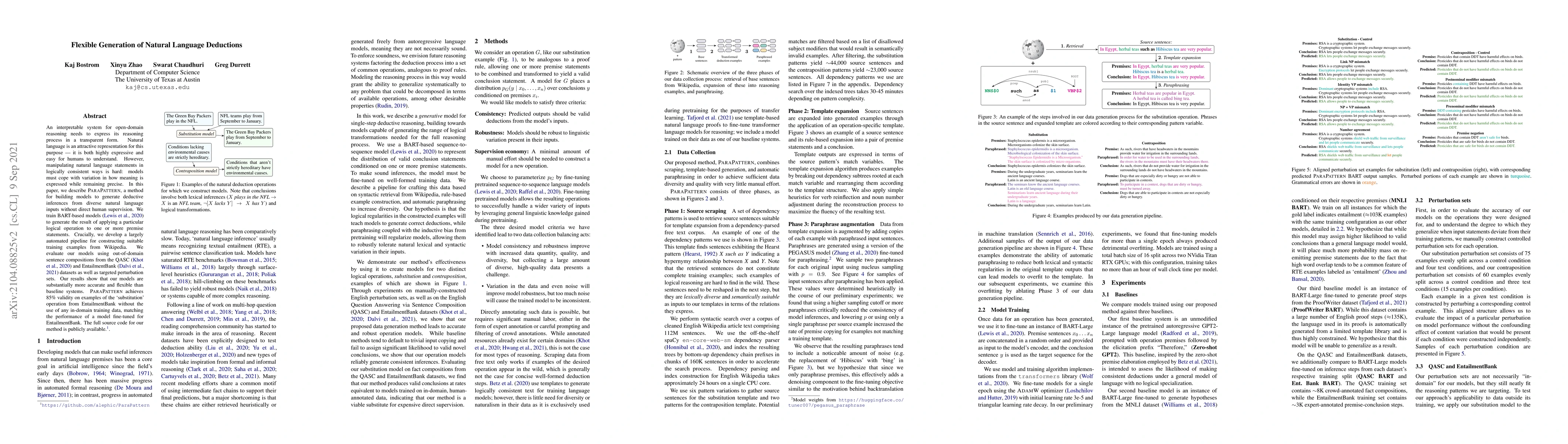 The research introduces ParaPattern, a method for training BART-based models to generate deductive inferences from diverse natural language inputs without direct human supervision. It leverages a largely automated pipeline for constructing training examples from Wikipedia.