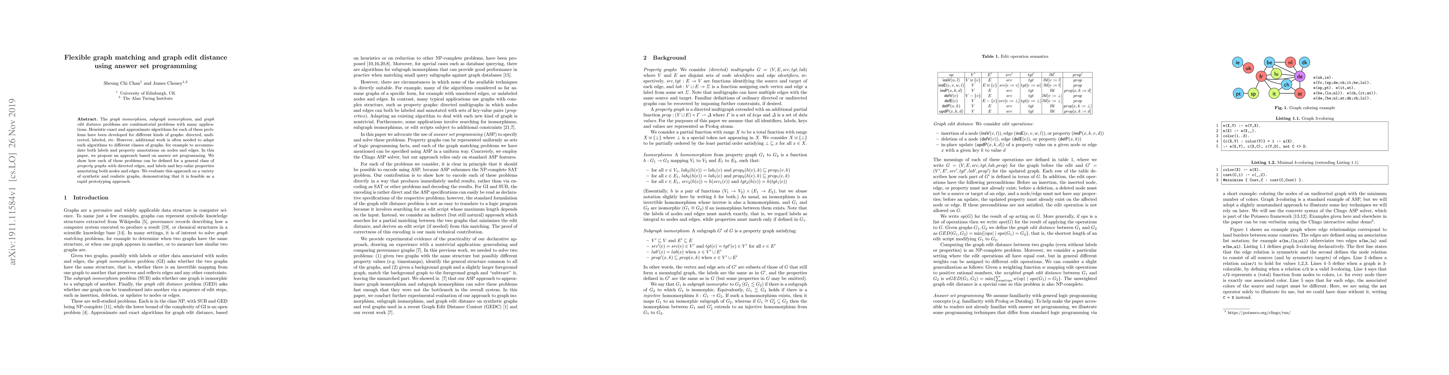 This paper proposes an answer set programming approach to solve graph isomorphism, subgraph isomorphism, and graph edit distance problems for property graphs, demonstrating its feasibility through evaluations on synthetic and realistic graphs. The method allows for flexible adaptation to different graph classes with node and edge annotations.