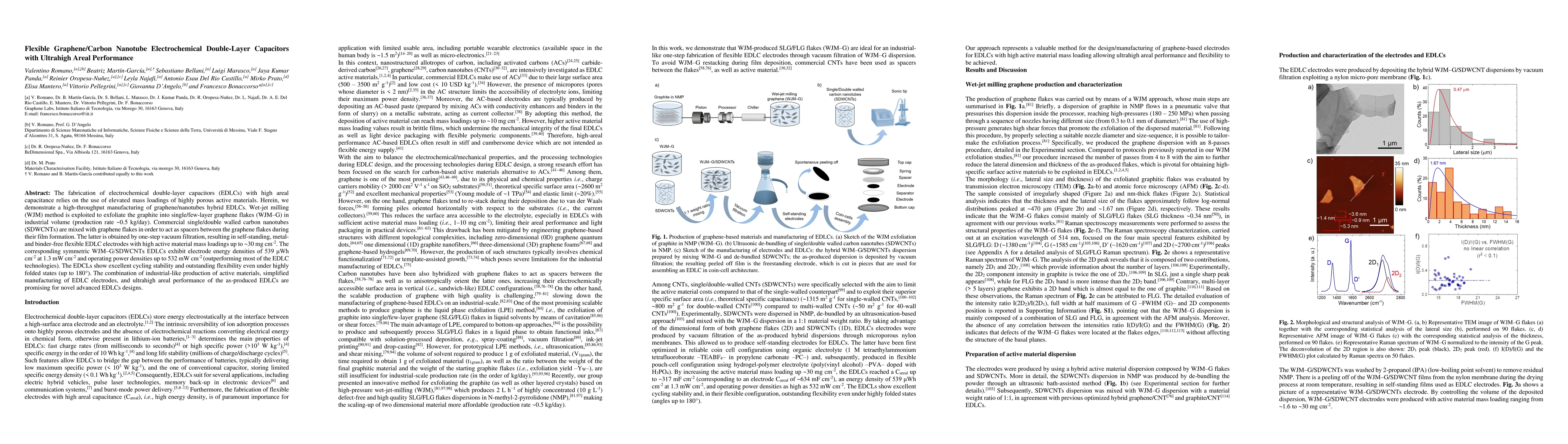 This paper presents a high-throughput method for producing flexible graphene/carbon nanotube electrochemical double-layer capacitors (EDLCs) with ultrahigh areal performance, achieving energy densities and power densities superior to most existing EDLC technologies while maintaining excellent flexibility and cycling stability.