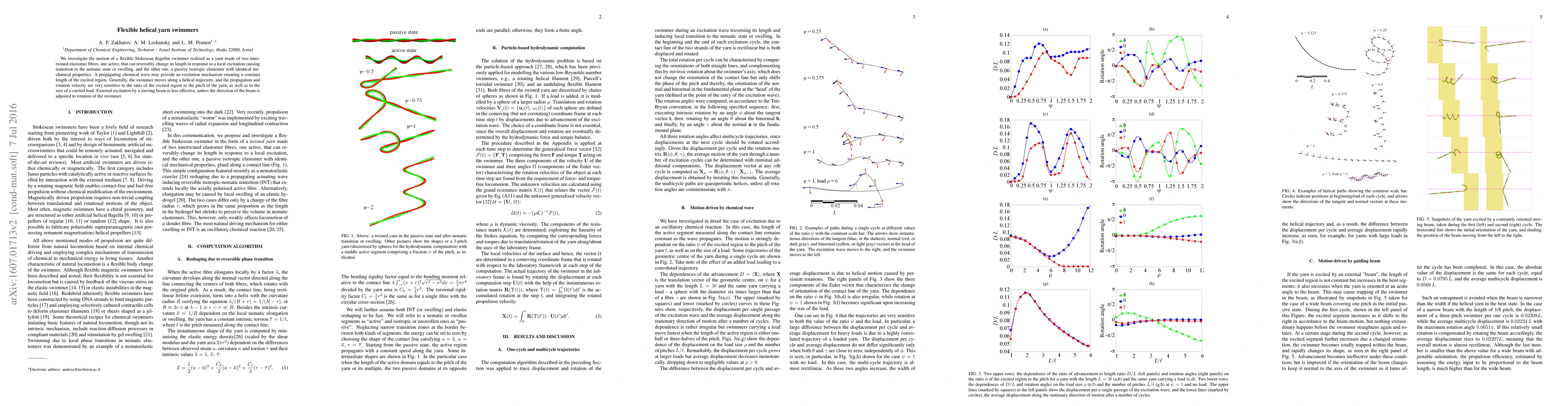 We investigate the motion of a flexible Stokesean flagellar swimmer realised as a yarn made of two intertwined elastomer fibres, one active, that can reversibly change its length in response to a local excitation causing transition to the nematic state or swelling, and the other one, a passive isotropic elastomer with identical mechanical properties. A propagating chemical wave may provide an excitation mechanism ensuring a constant length of the excited region. Generally, the swimmer moves along a helical trajectory, and the propagation and rotation velocity are very sensitive to the ratio of the excited region to the pitch of the yarn, as well as to the size of a carried load. External excitation by a moving beam is less effective, unless the direction of the beam is adjusted to rotation of the swimmer.