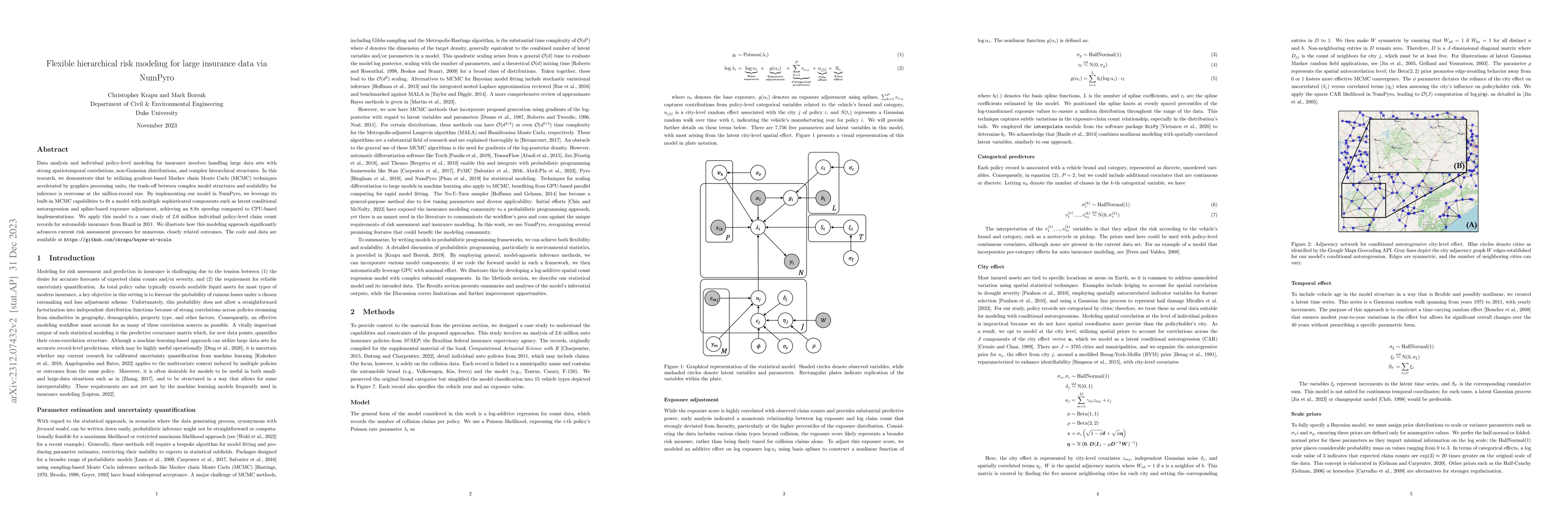 This paper presents a scalable hierarchical risk model for large insurance data using NumPyro and GPU-accelerated MCMC, achieving an 8.8x speedup over CPU-based methods. The model incorporates advanced components like latent conditional autoregression and spline-based exposure adjustment, demonstrated through a case study on 2.6 million automobile insurance claims from Brazil in 2011.