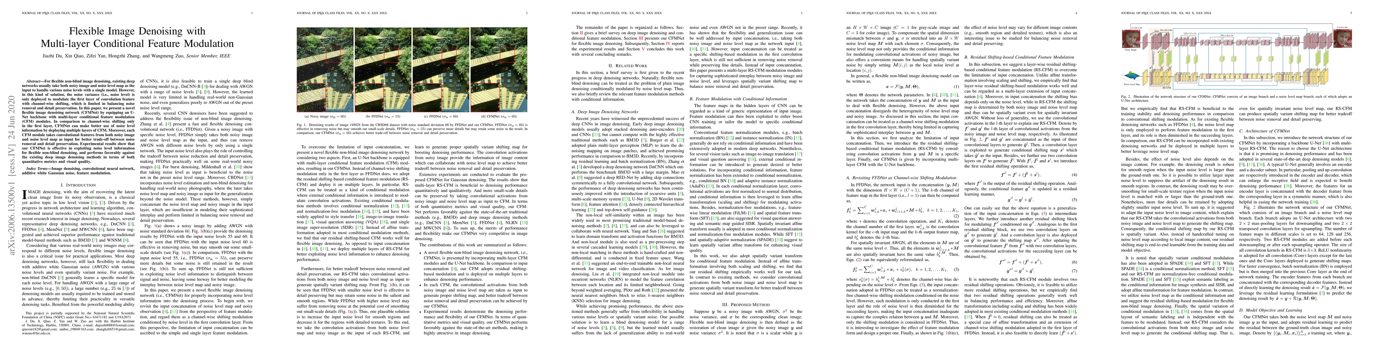 This paper introduces CFMNet, a novel flexible image denoising network that uses multi-layer conditional feature modulation (CFM) modules to better utilize noise level information for improved noise removal and detail preservation. Compared to existing methods, CFMNet achieves better results through multiple layers of CFM, outperforming them in both quantitative metrics and visual quality.