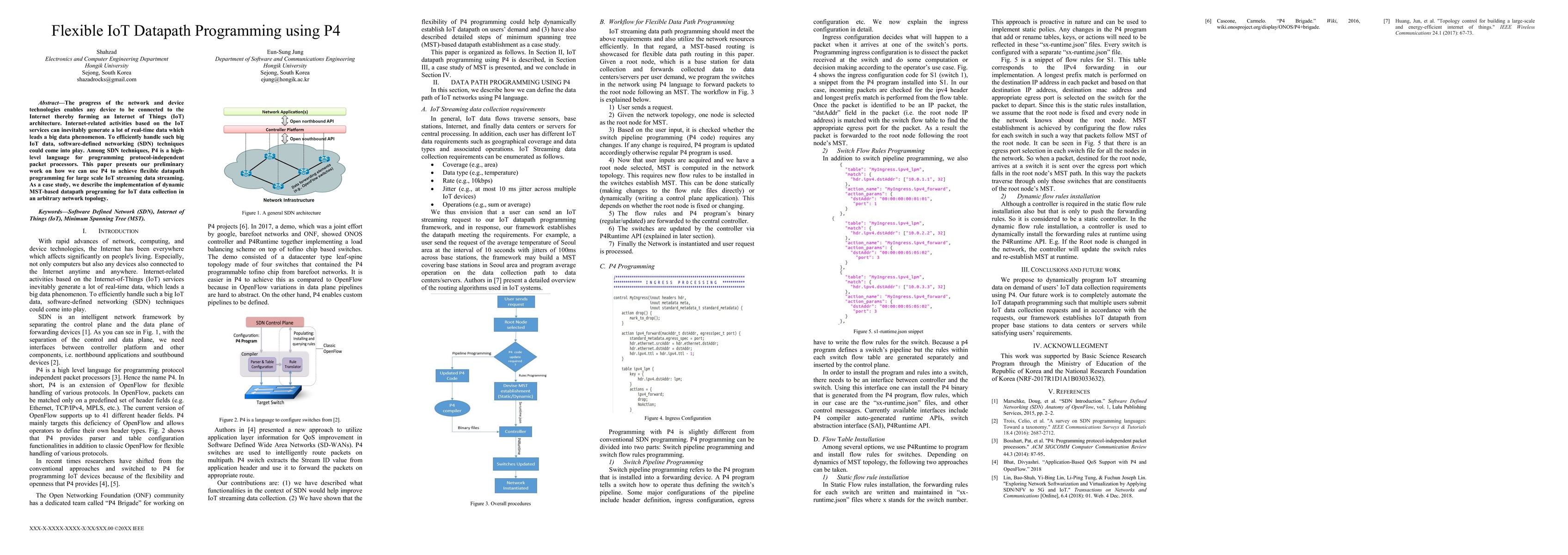 This paper explores using P4, a high-level programming language for protocol-independent packet processors, to enable flexible datapath programming for managing large-scale IoT streaming data. It demonstrates dynamic MST-based datapath programming for IoT data collection in various network topologies.