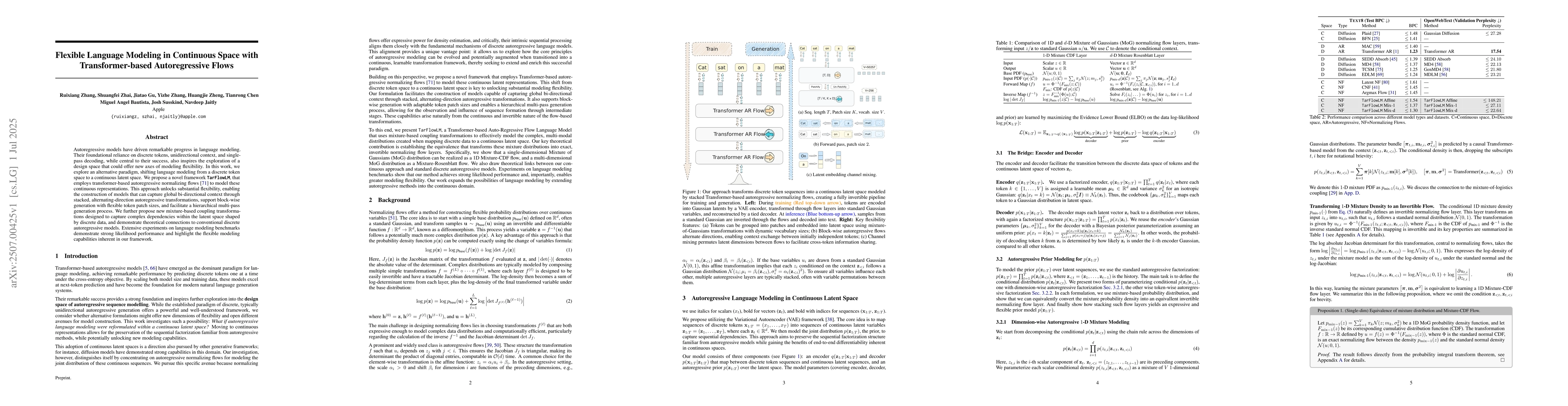 TarFlowLM introduces transformer-based autoregressive normalizing flows for continuous latent space language modeling, enabling flexible construction of models with bi-directional context and hierarchical generation processes.