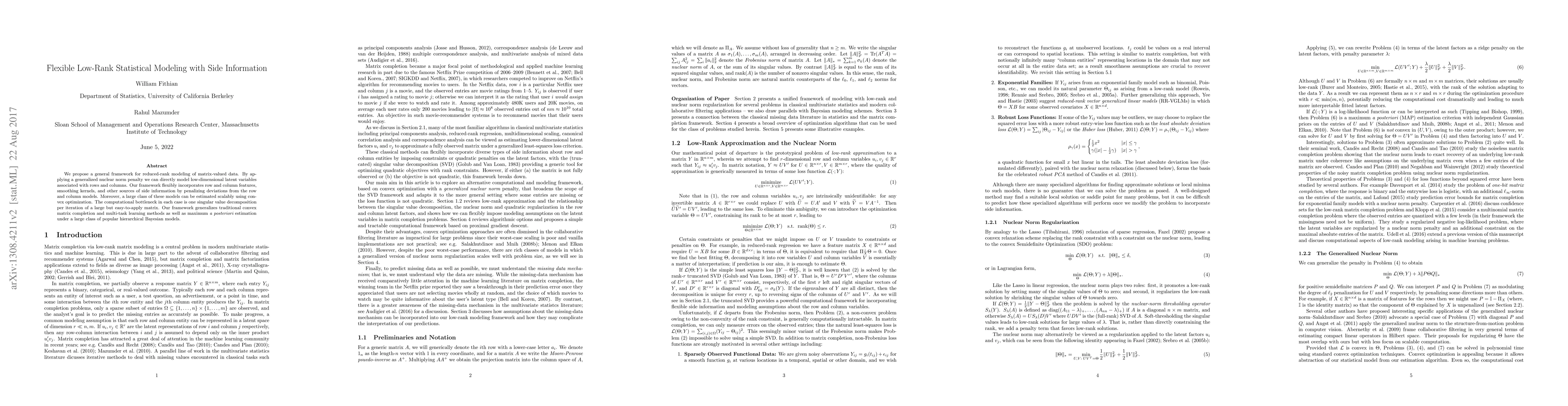 We propose a general framework for reduced-rank modeling of matrix-valued data. By applying a generalized nuclear norm penalty we can directly model low-dimensional latent variables associated with rows and columns. Our framework flexibly incorporates row and column features, smoothing kernels, and other sources of side information by penalizing deviations from the row and column models. Moreover, a large class of these models can be estimated scalably using convex optimization. The computational bottleneck in each case is one singular value decomposition per iteration of a large but easy-to-apply matrix. Our framework generalizes traditional convex matrix completion and multi-task learning methods as well as maximum a posteriori estimation under a large class of popular hierarchical Bayesian models.
