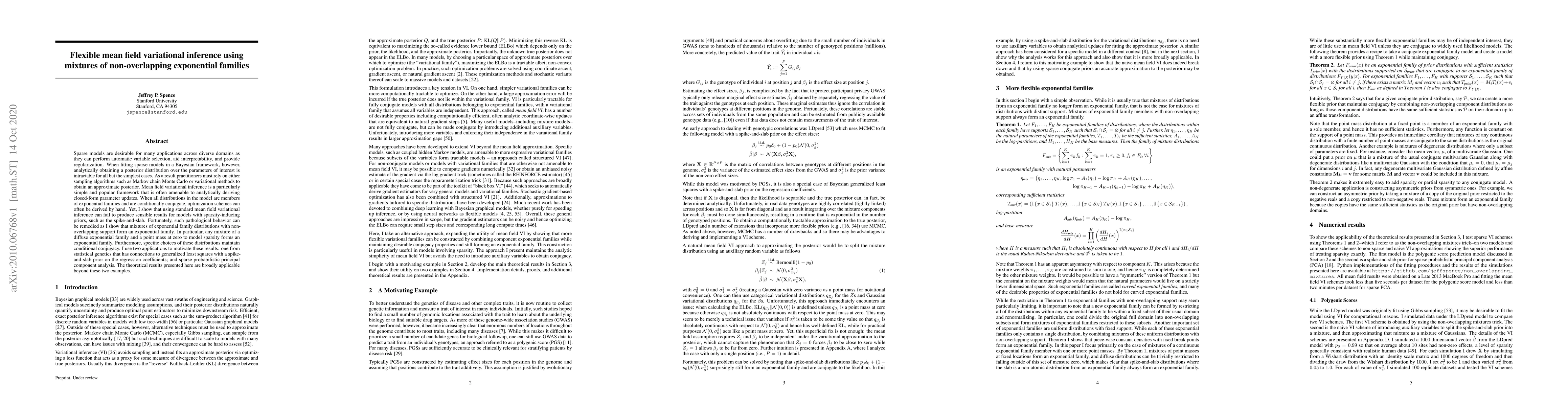 This paper proposes flexible mean field variational inference using mixtures of non-overlapping exponential families to handle sparse models in Bayesian frameworks. It demonstrates that standard mean field variational inference can fail for sparsity-inducing priors, but mixtures of exponential families with non-overlapping support can remedy this issue, maintaining conditional conjugacy and enabling practical applications in statistical genetics and sparse probabilistic principal component analysis.