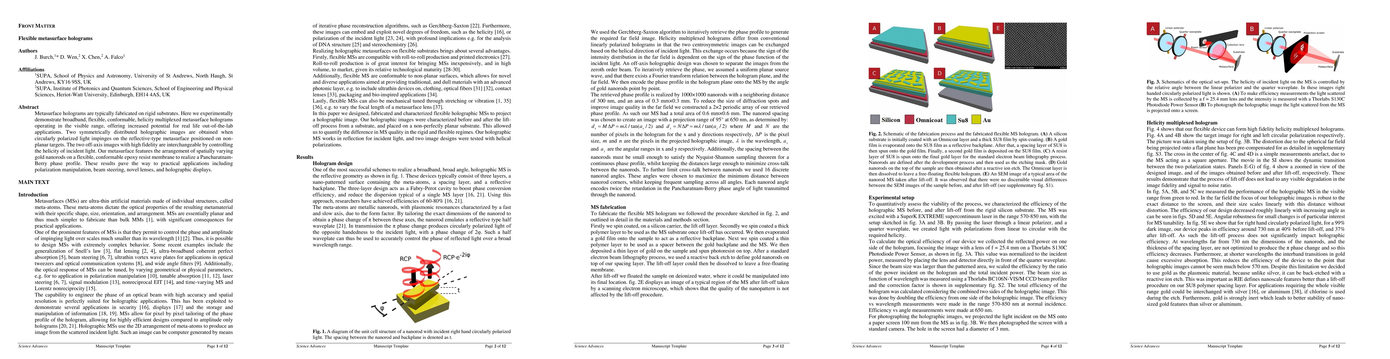 This paper demonstrates the creation of flexible, broadband metasurface holograms using a reflective-type design on a conformable epoxy resist membrane. The holograms can display two interchangeable holographic images based on the polarization of the incident light, paving the way for applications in polarization manipulation, beam steering, and holographic displays.