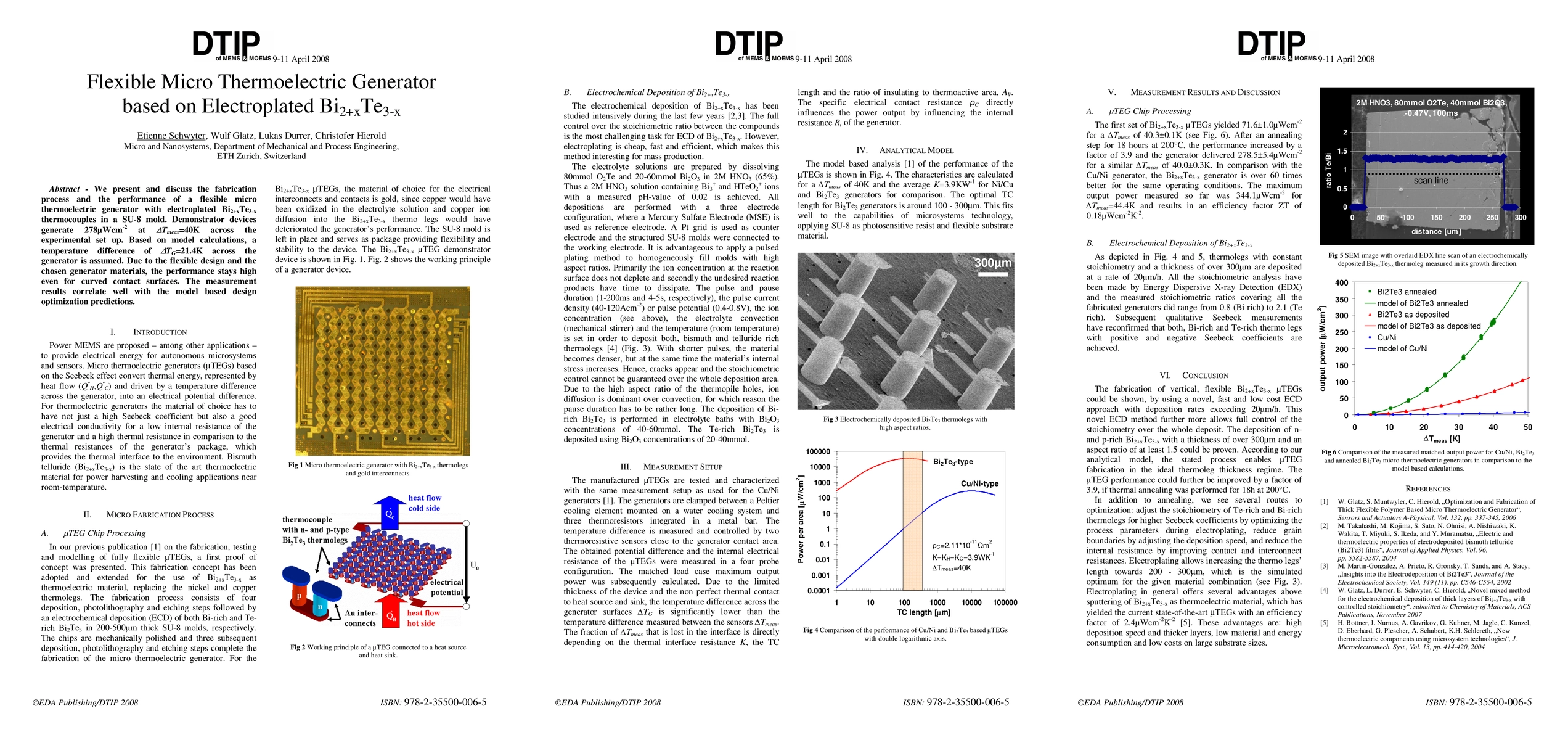 Researchers developed a flexible micro thermoelectric generator using electroplated Bi2Te3 thermocouples, achieving 278uWcm-2 power output at 40K temperature difference.