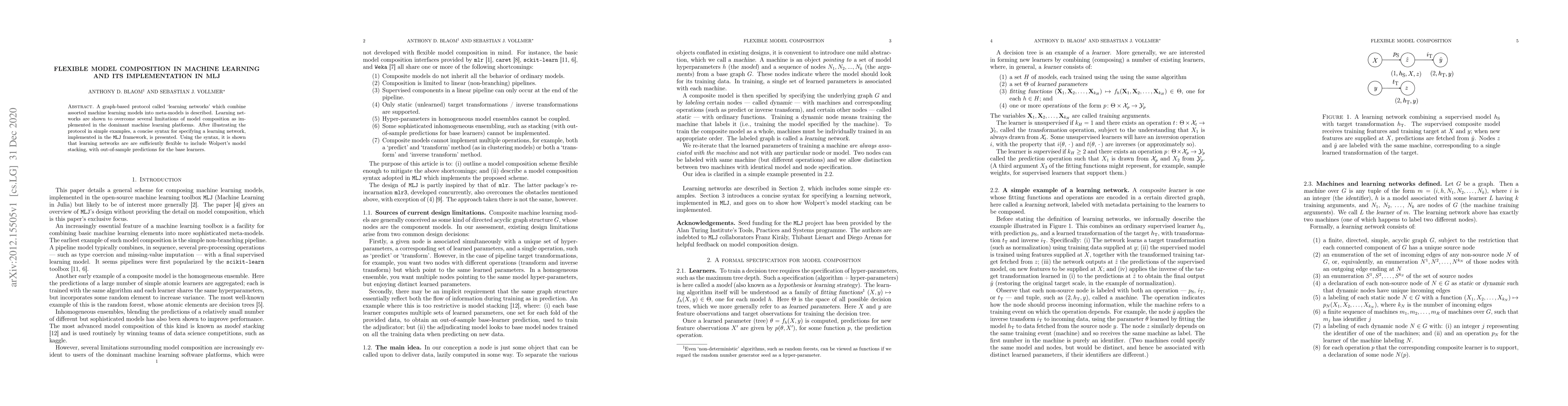 Researchers introduce a flexible model composition method called learning networks that combine multiple machine learning models into meta-models, overcoming limitations of existing platforms. A concise syntax for specifying these networks is provided in the MLJ framework.