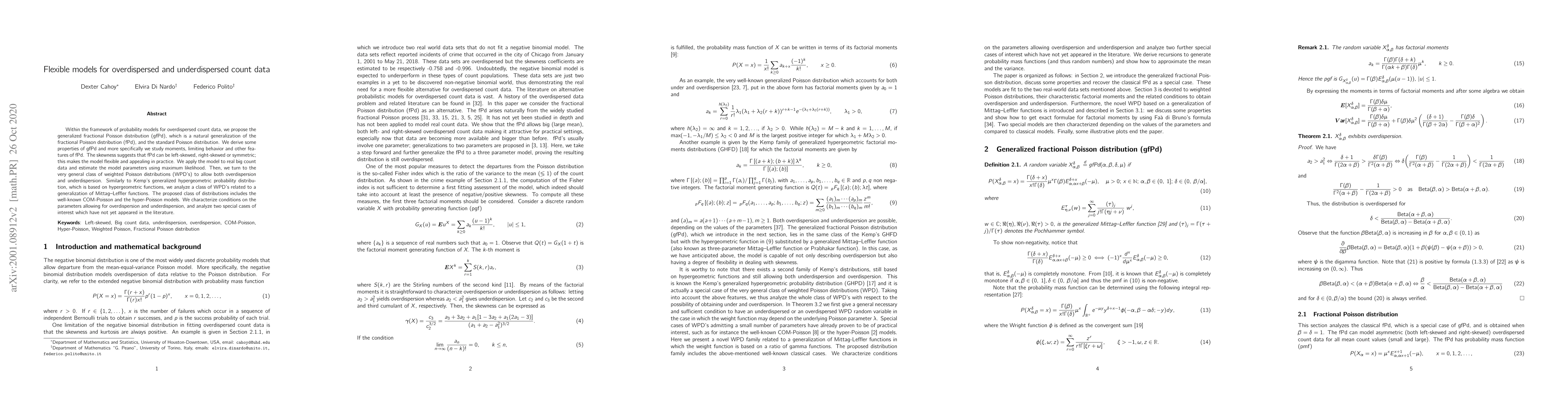 Within the framework of probability models for overdispersed count data, we propose the generalized fractional Poisson distribution (gfPd), which is a natural generalization of the fractional Poisson distribution (fPd), and the standard Poisson distribution. We derive some properties of gfPd and more specifically we study moments, limiting behavior and other features of fPd. The skewness suggests that fPd can be left-skewed, right-skewed or symmetric; this makes the model flexible and appealing in practice. We apply the model to real big count data and estimate the model parameters using maximum likelihood. Then, we turn to the very general class of weighted Poisson distributions (WPD's) to allow both overdispersion and underdispersion. Similarly to Kemp's generalized hypergeometric probability distribution, which is based on hypergeometric functions, we analyze a class of WPD's related to a generalization of Mittag--Leffler functions. The proposed class of distributions includes the well-known COM-Poisson and the hyper-Poisson models. We characterize conditions on the parameters allowing for overdispersion and underdispersion, and analyze two special cases of interest which have not yet appeared in the literature.