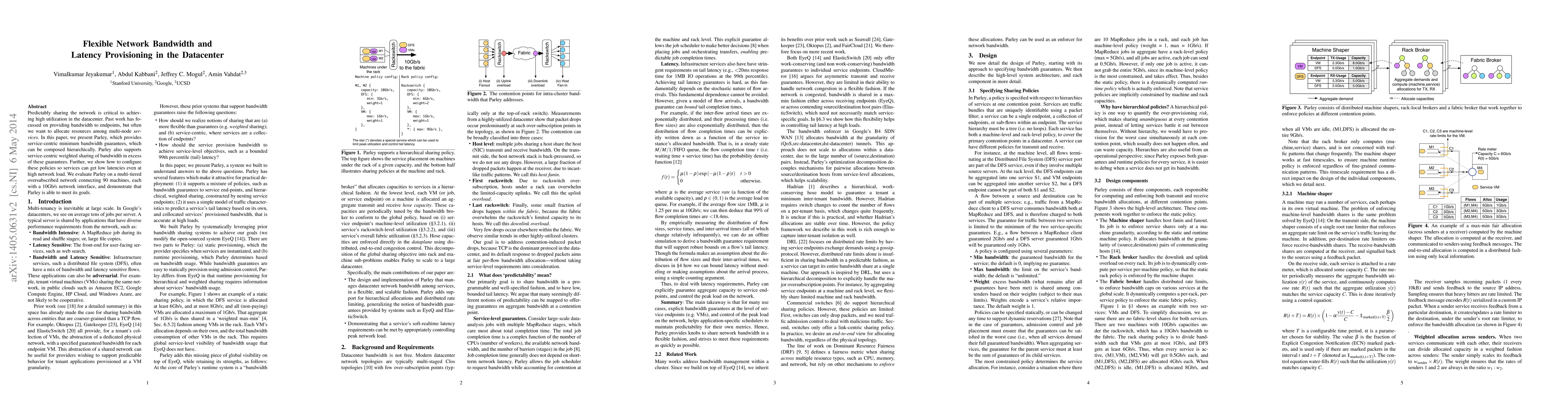 This paper introduces Parley, a system that provides service-centric minimum bandwidth guarantees and supports weighted sharing of excess bandwidth in datacenters, achieving high utilization and low latency.