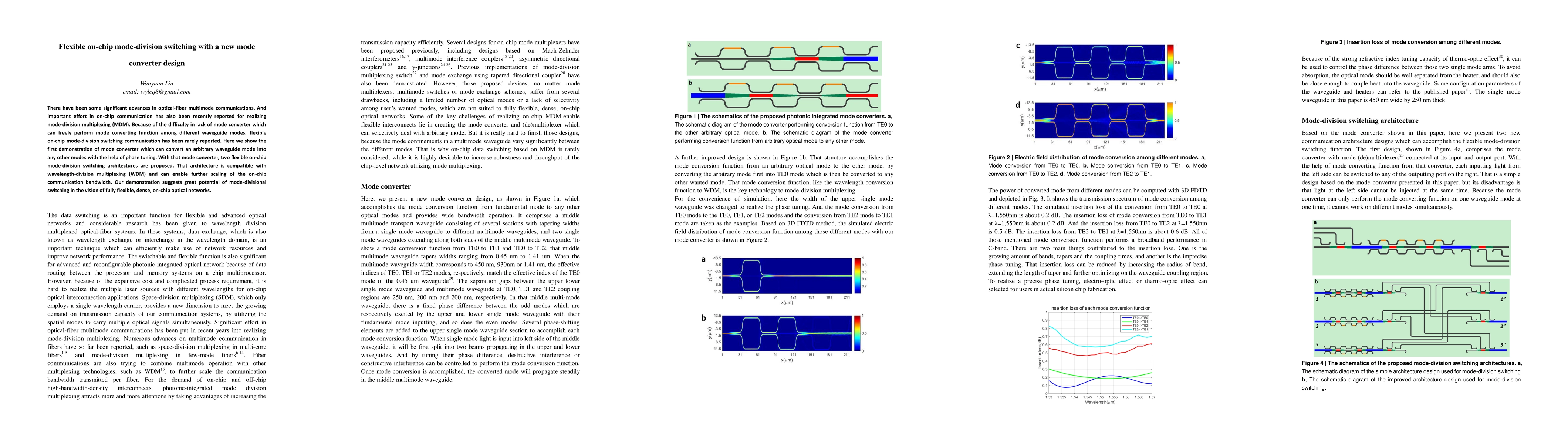 There have been some significant advances in optical-fiber multimode communications. And important effort in on-chip communication has also been recently reported for realizing mode-division multiplexing (MDM). Because of the difficulty in lack of mode converter which can freely perform mode converting function among different waveguide modes, flexible on-chip mode-division switching communication has been rarely reported. Here we show the first demonstration of mode converter which can convert an arbitrary waveguide mode into any other modes with the help of phase tuning. With that mode converter, two flexible on-chip mode-division switching architectures are proposed. That architecture is compatible with wavelength-division multiplexing (WDM) and can enable further scaling of the on-chip communication bandwidth. Our demonstration suggests great potential of mode-divisional switching in the vision of fully flexible, dense, on-chip optical networks.